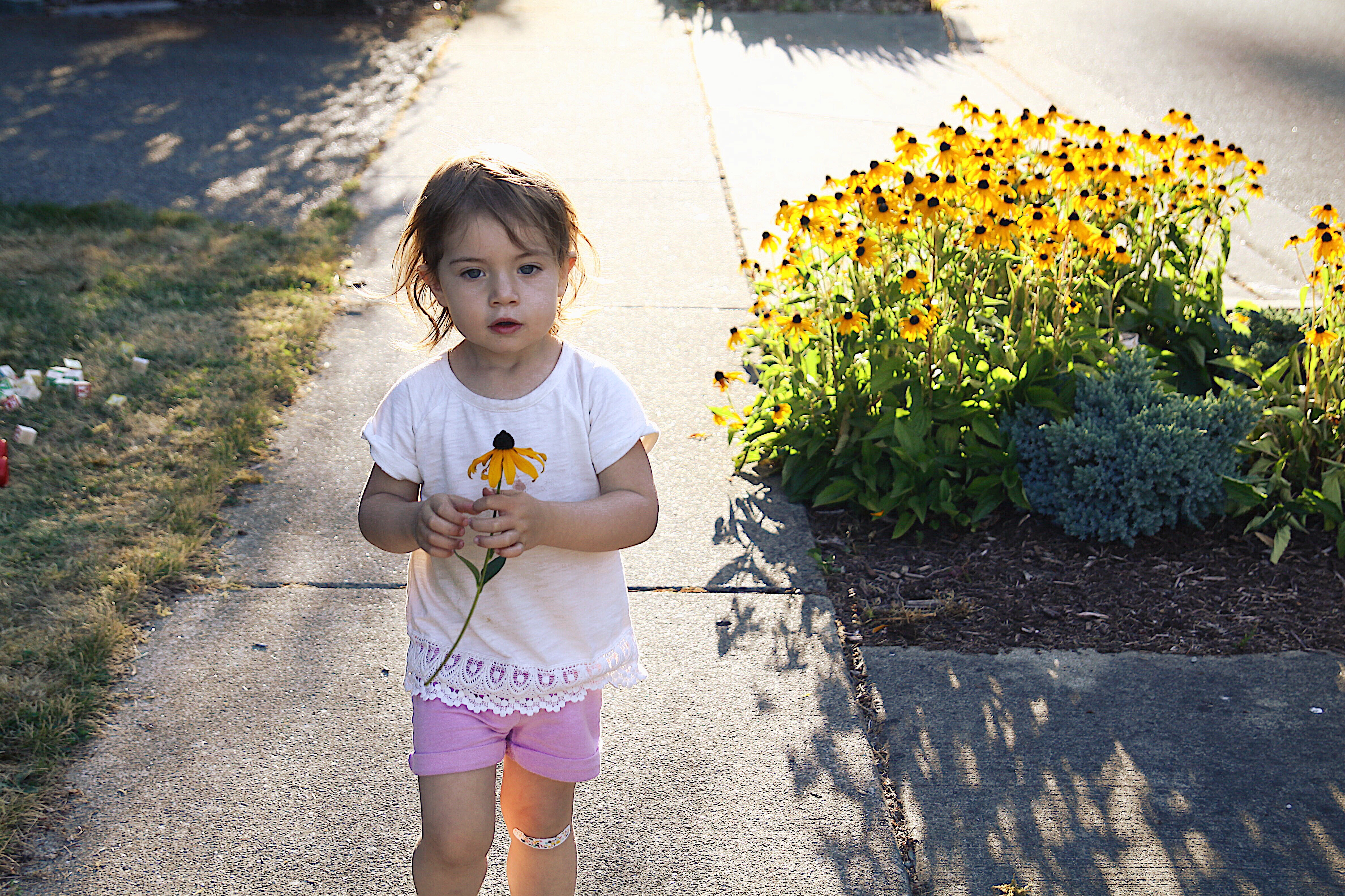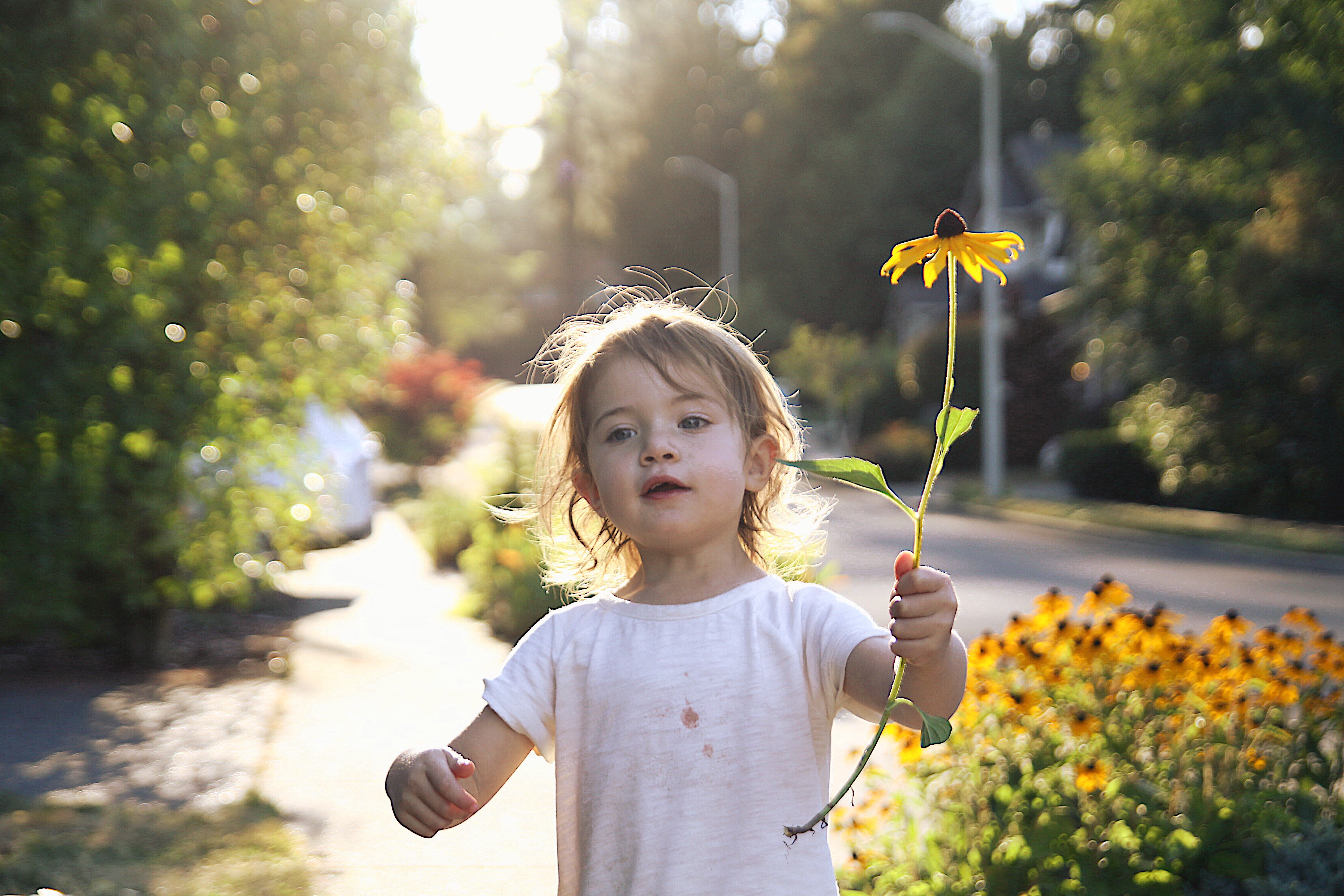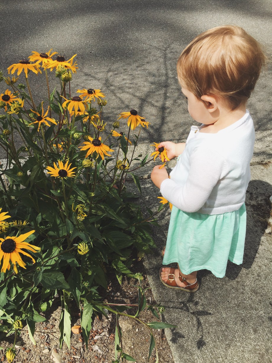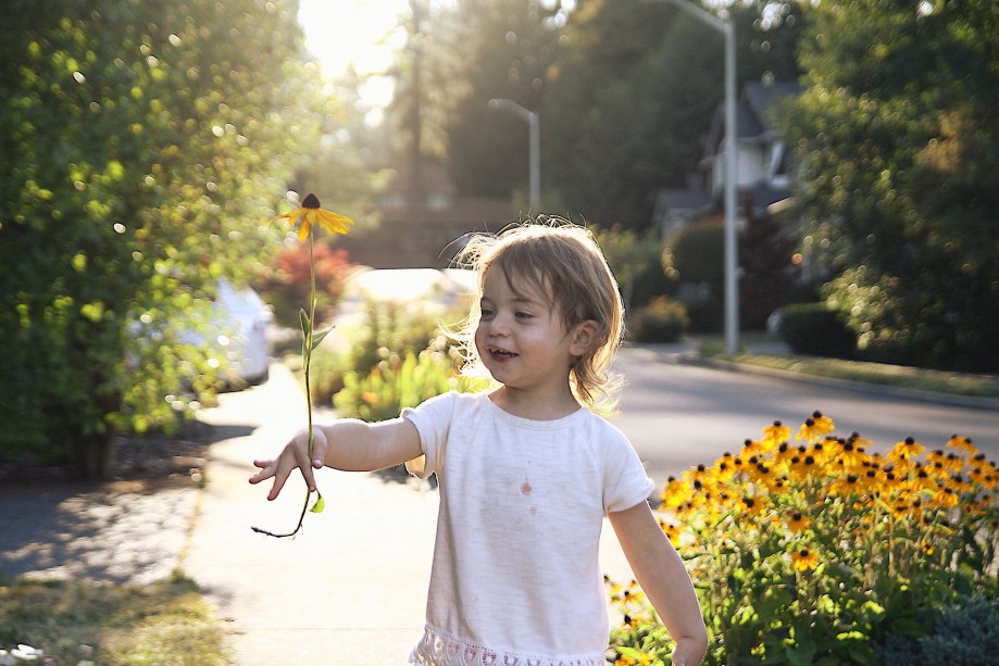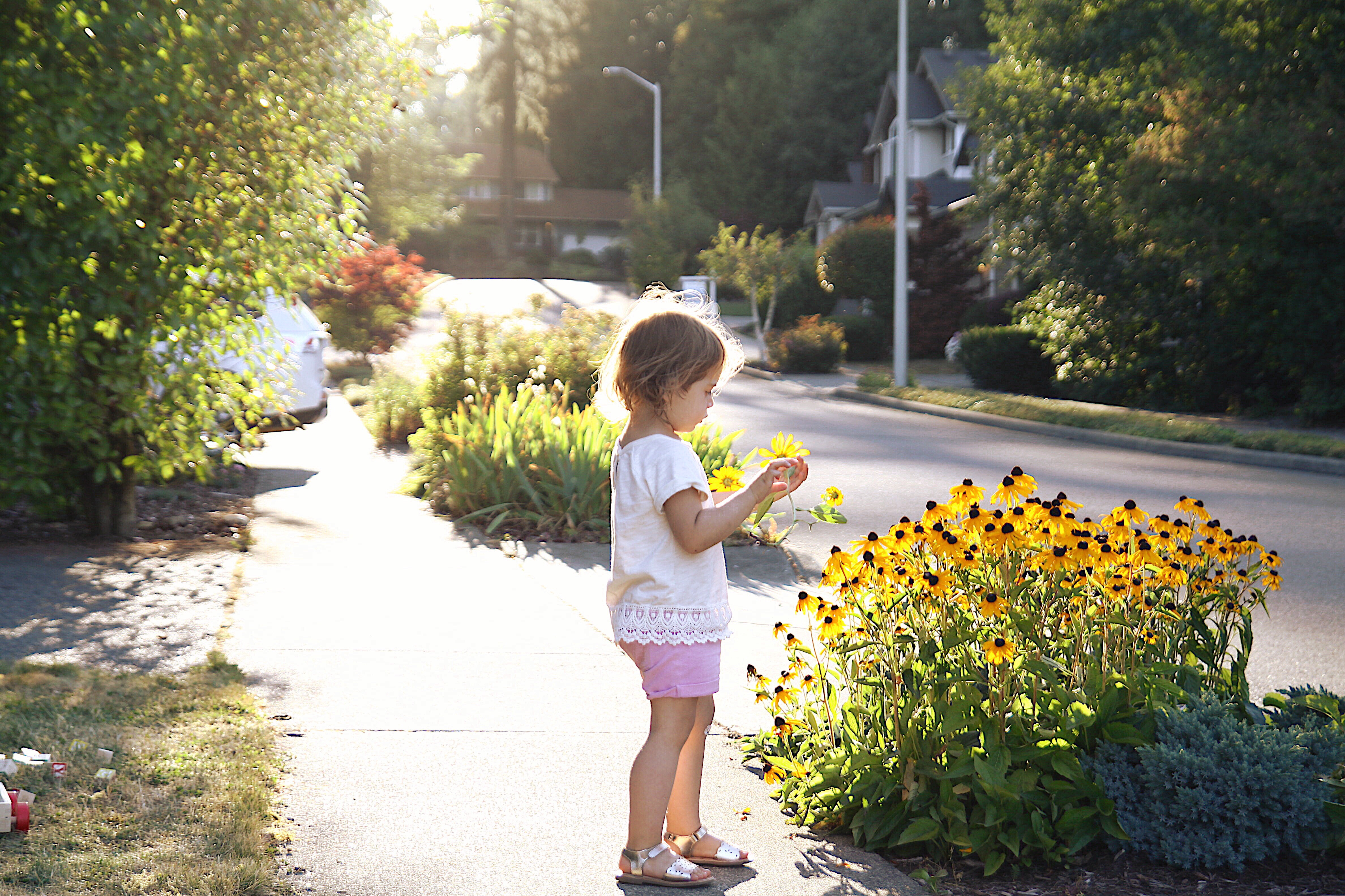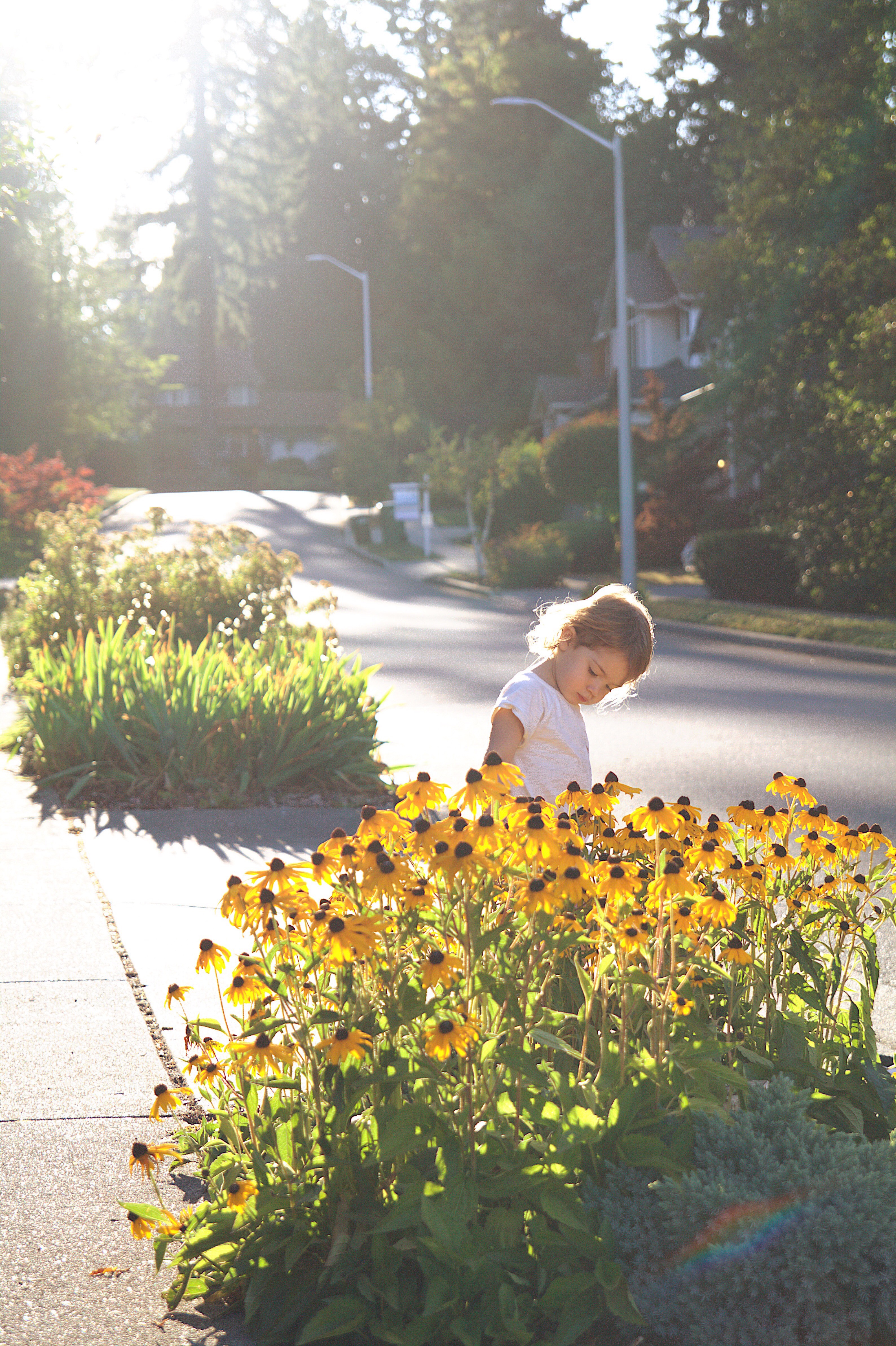 These yellow flowers are the one thing in our yard that have withstood my neglect and I live how bright and cheery they are. I’ve taken photos of Ellie with these flowers over the last couple of years because she likes to help water them (when we remember to!). Don’t be fooled by these pictures – they were incredibly hard to take as the light was beautiful and I tried every trick in the book to get Ellie to that light and those flowers – all while Lila was strapped to me. Totally worth it :).