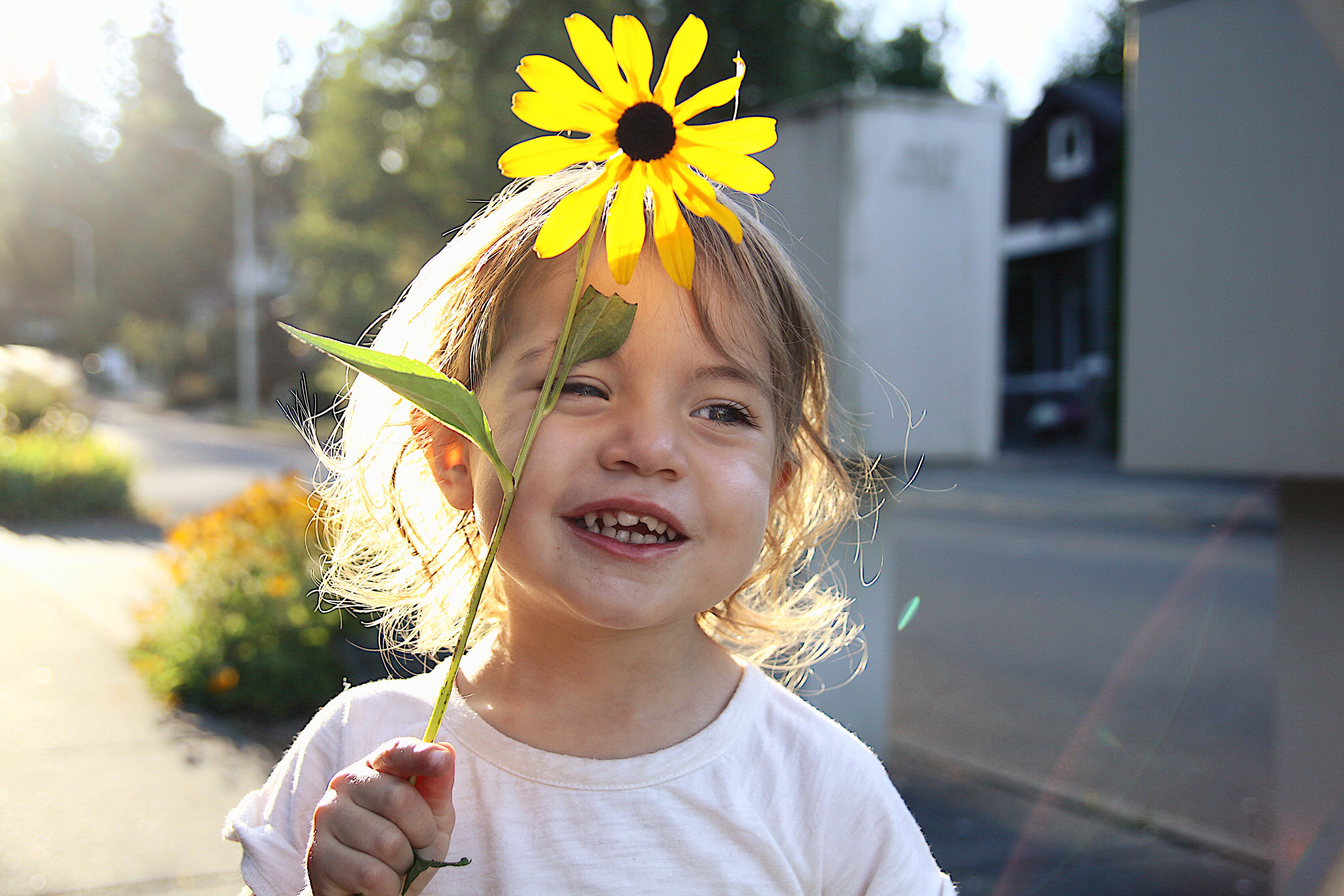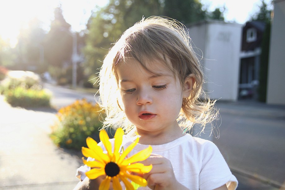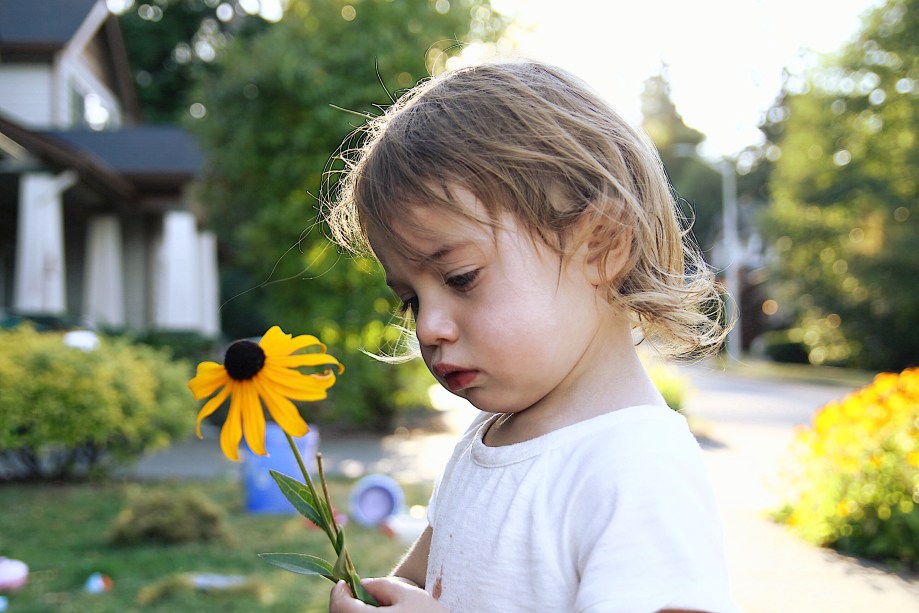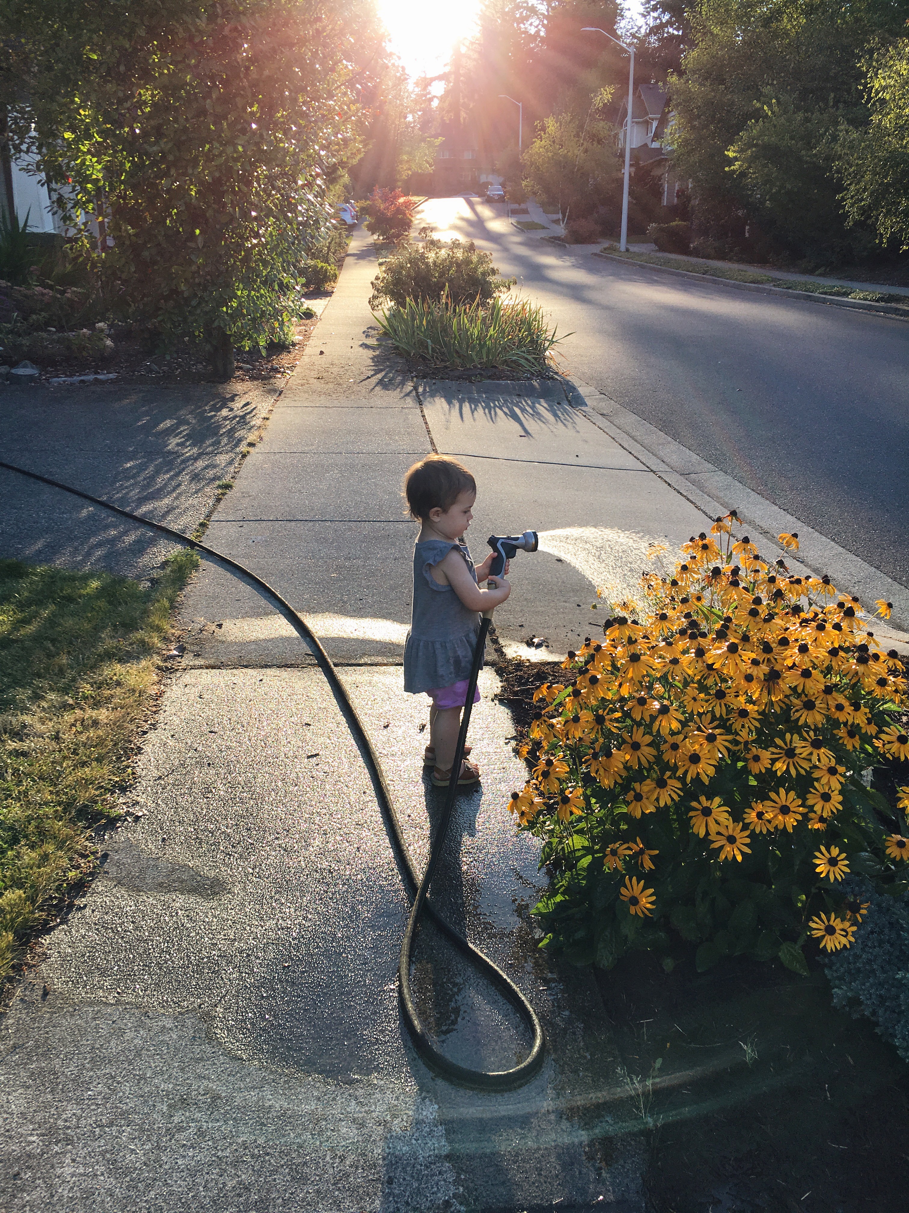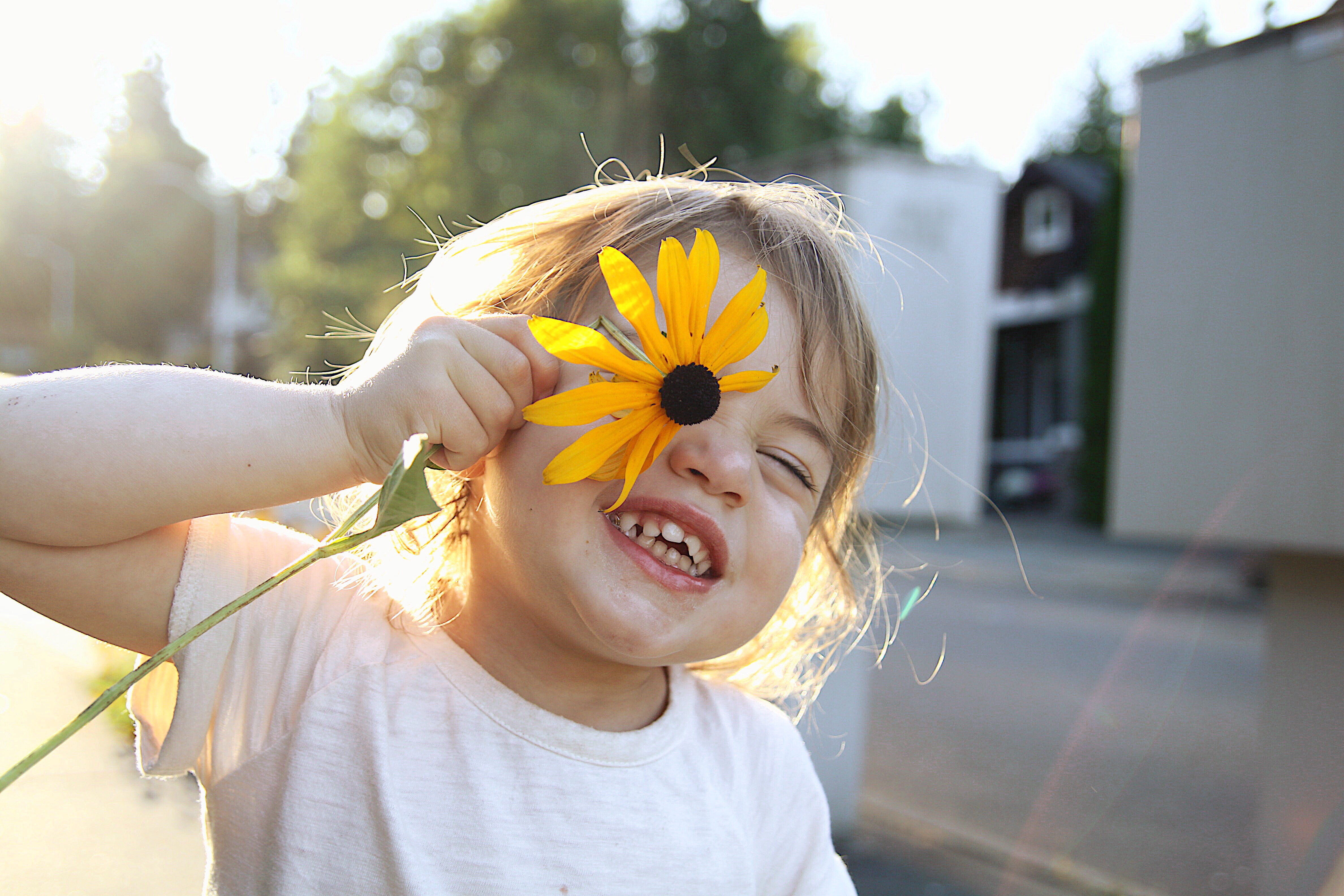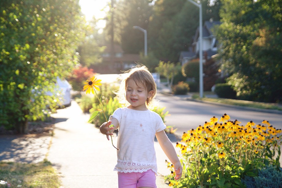 These yellow flowers are the one thing in our yard that have withstood my neglect and I live how bright and cheery they are. I’ve taken photos of Ellie with these flowers over the last couple of years because she likes to help water them (when we remember to!). Don’t be fooled by these pictures – they were incredibly hard to take as the light was beautiful and I tried every trick in the book to get Ellie to that light and those flowers – all while Lila was strapped to me. Totally worth it :).