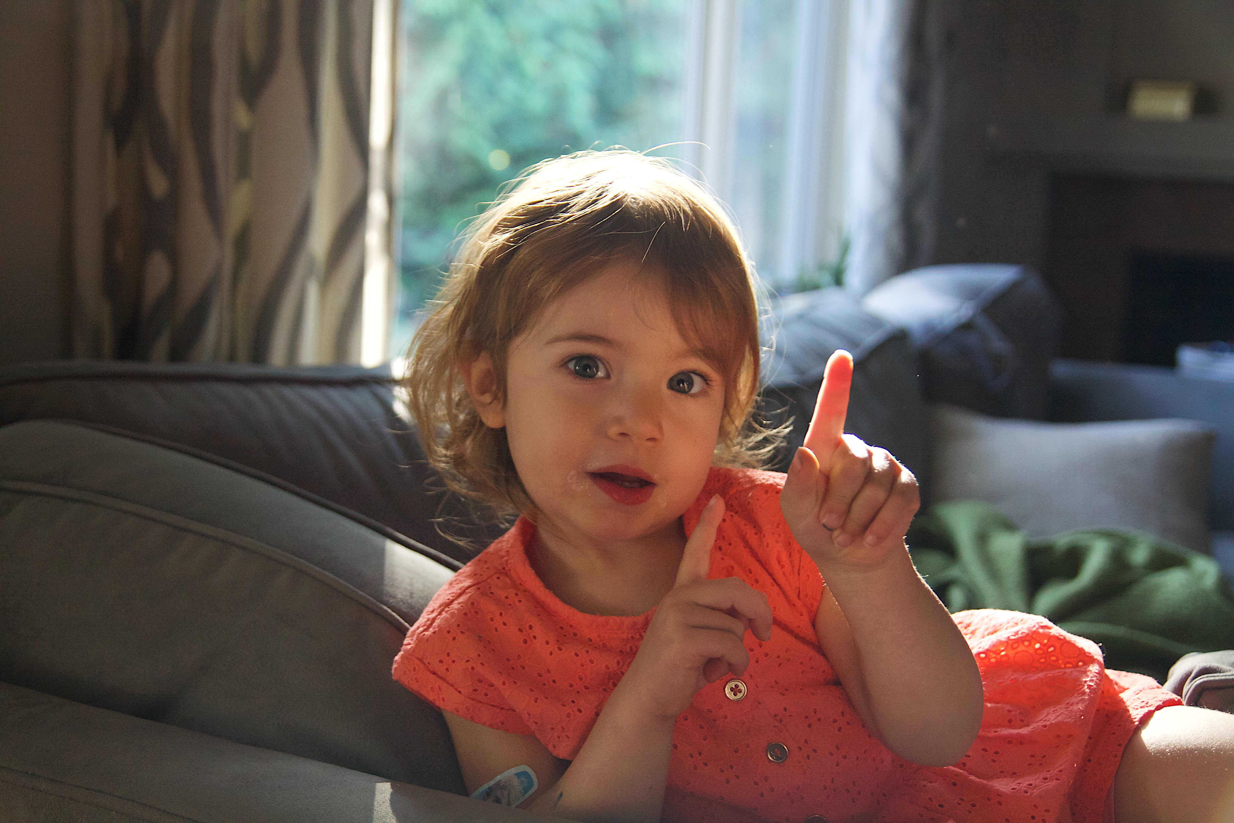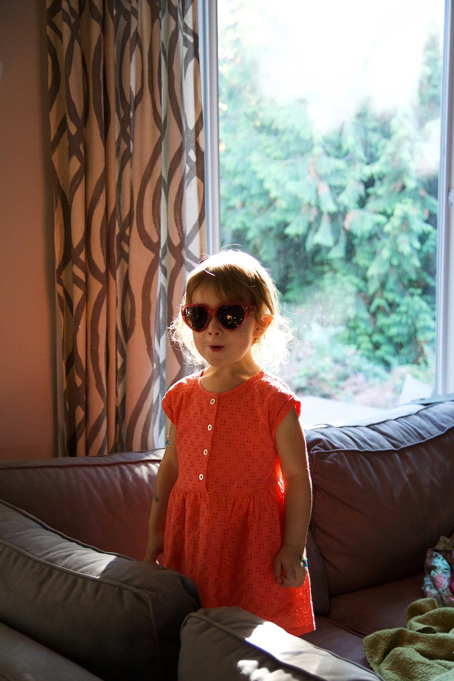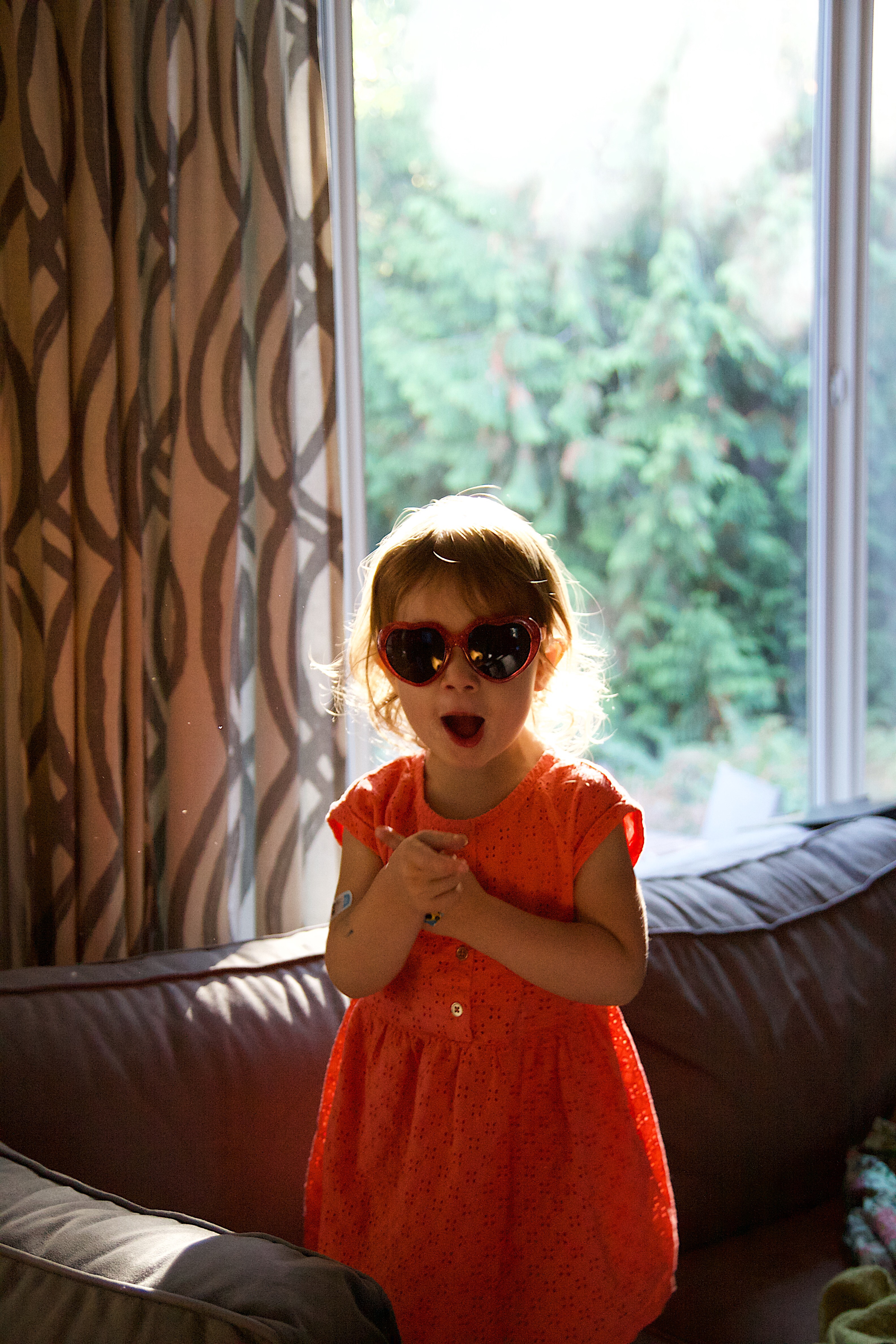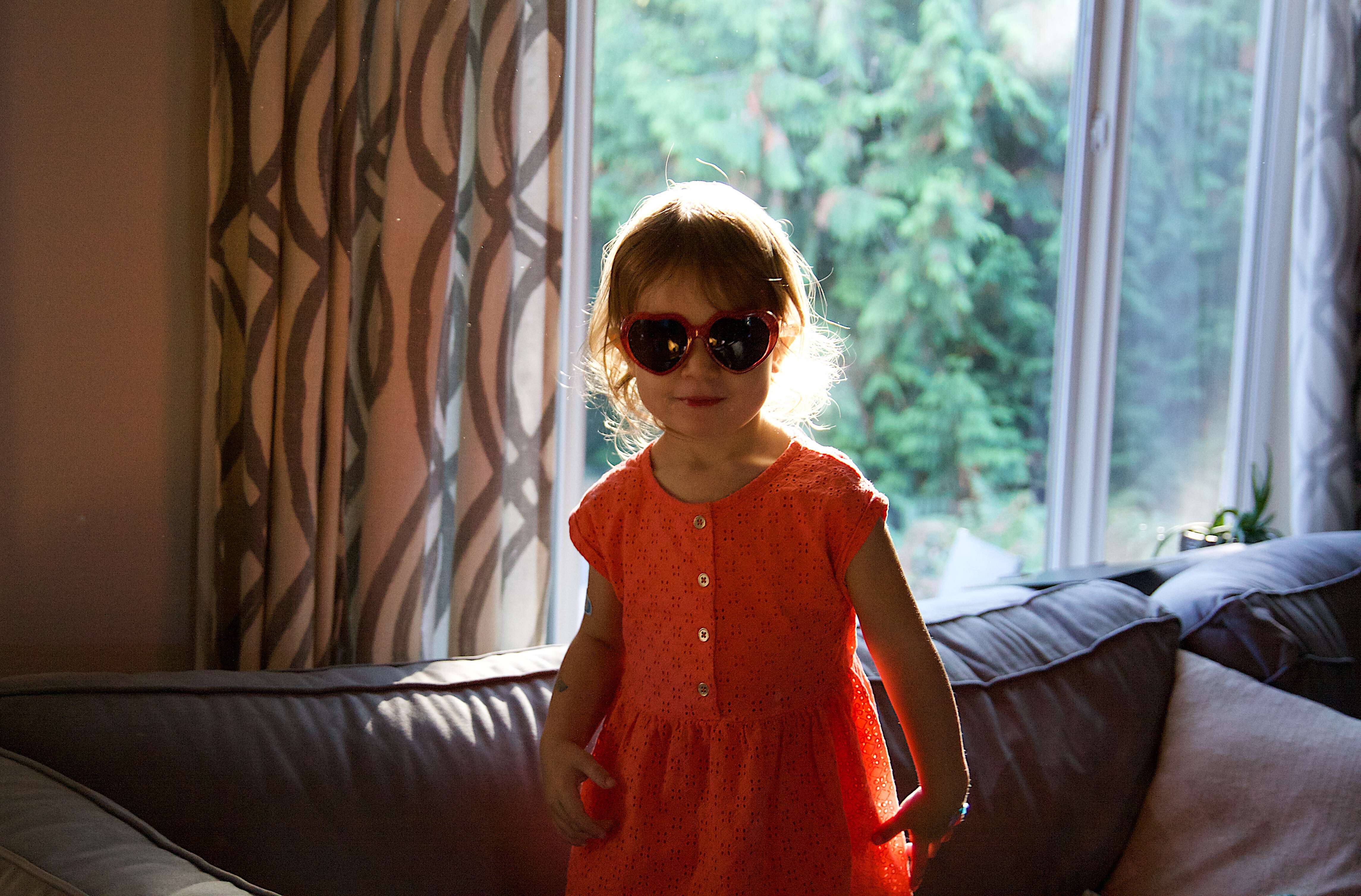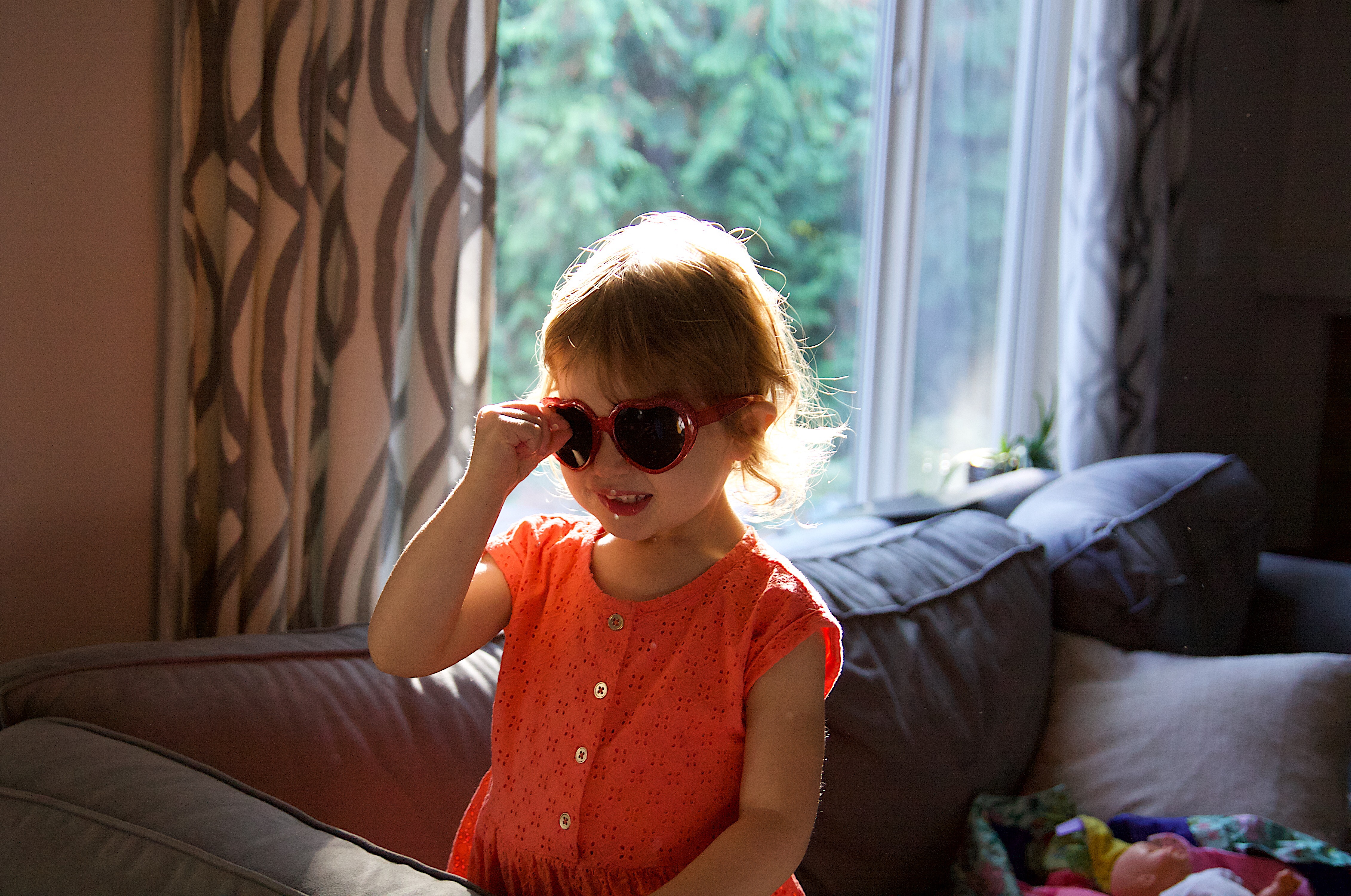 Ellie’s got a big personality. Lots of stories. Lots of feelings. Lots of opinions… I love it all. She put on these sunglasses and I may have bribed her to stand in the pretty light ;). Right now on any given day she tells us her favorite color is orange, red or blue. This outfit matches her personality and what she likes so I just had to capture it. Then, of course, since she’s a master negotiator, she asked for one more episode of Dora (you can tell in one of the photos below). Some days her persistence and spunk are hard to manage, but it comes out in a lot of fun ways too.