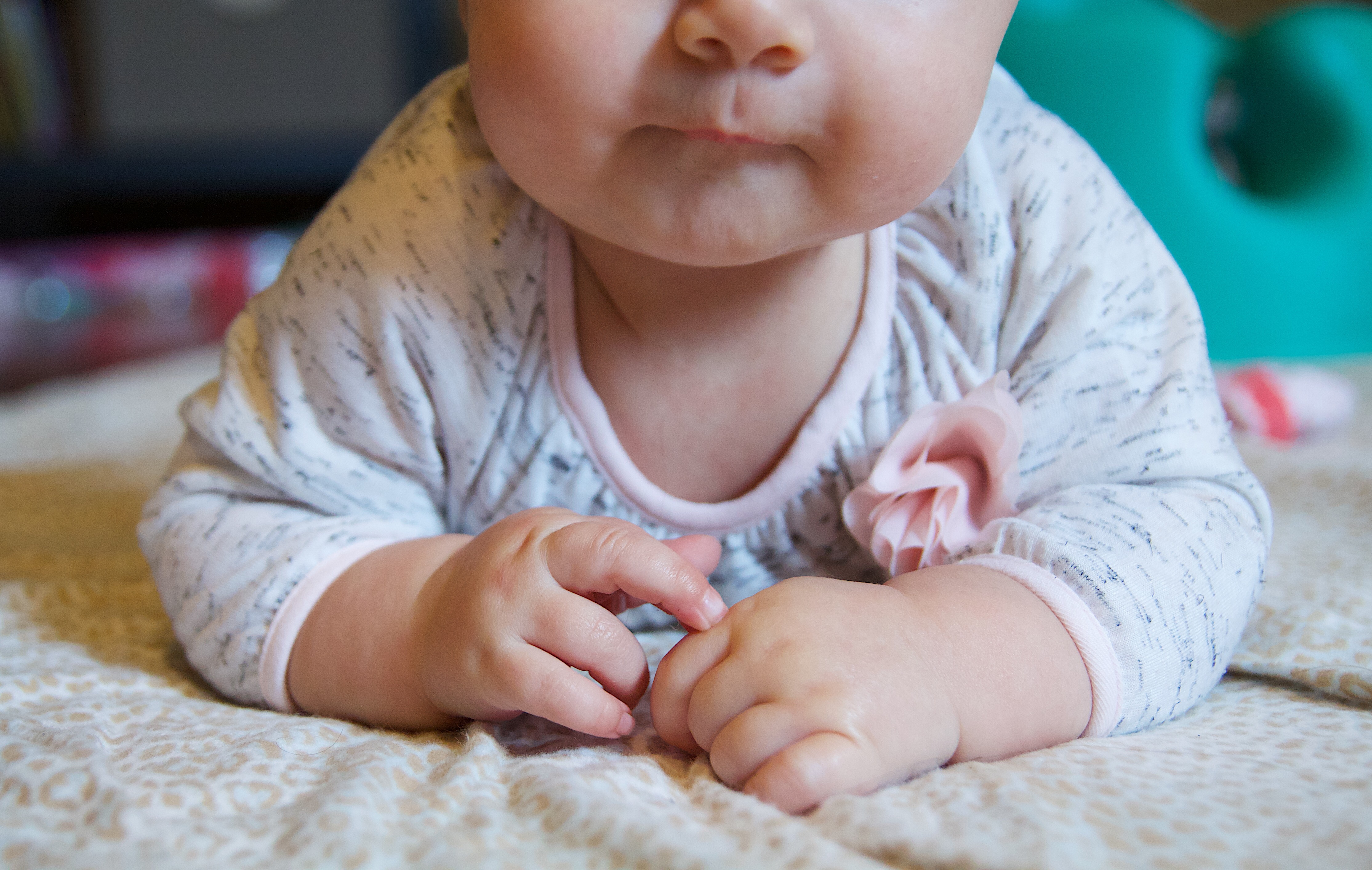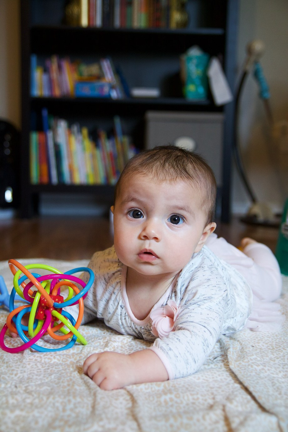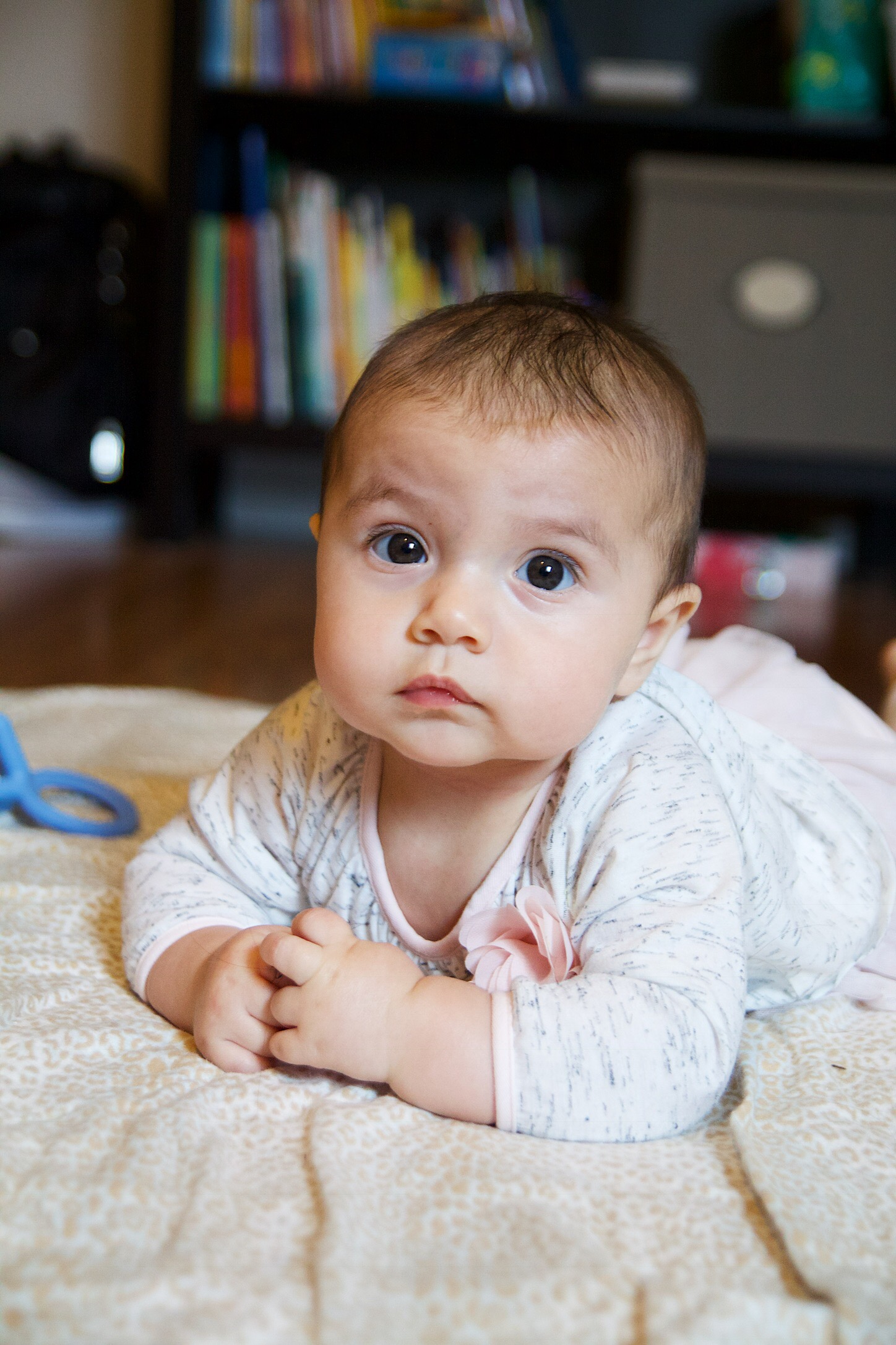 She rolled over three times before anyone saw. The first time I was in the bathroom and when I came out she was on her tummy instead of her back like I left her. I got all excited and cheered her on and she just gave me this look like, “What? That was hard?” She had already rolled from tummy to back a few times, but hated every second of it so she wasn’t too excited to try it much after that. She generally just likes to roll onto her side rather than go the whole way.