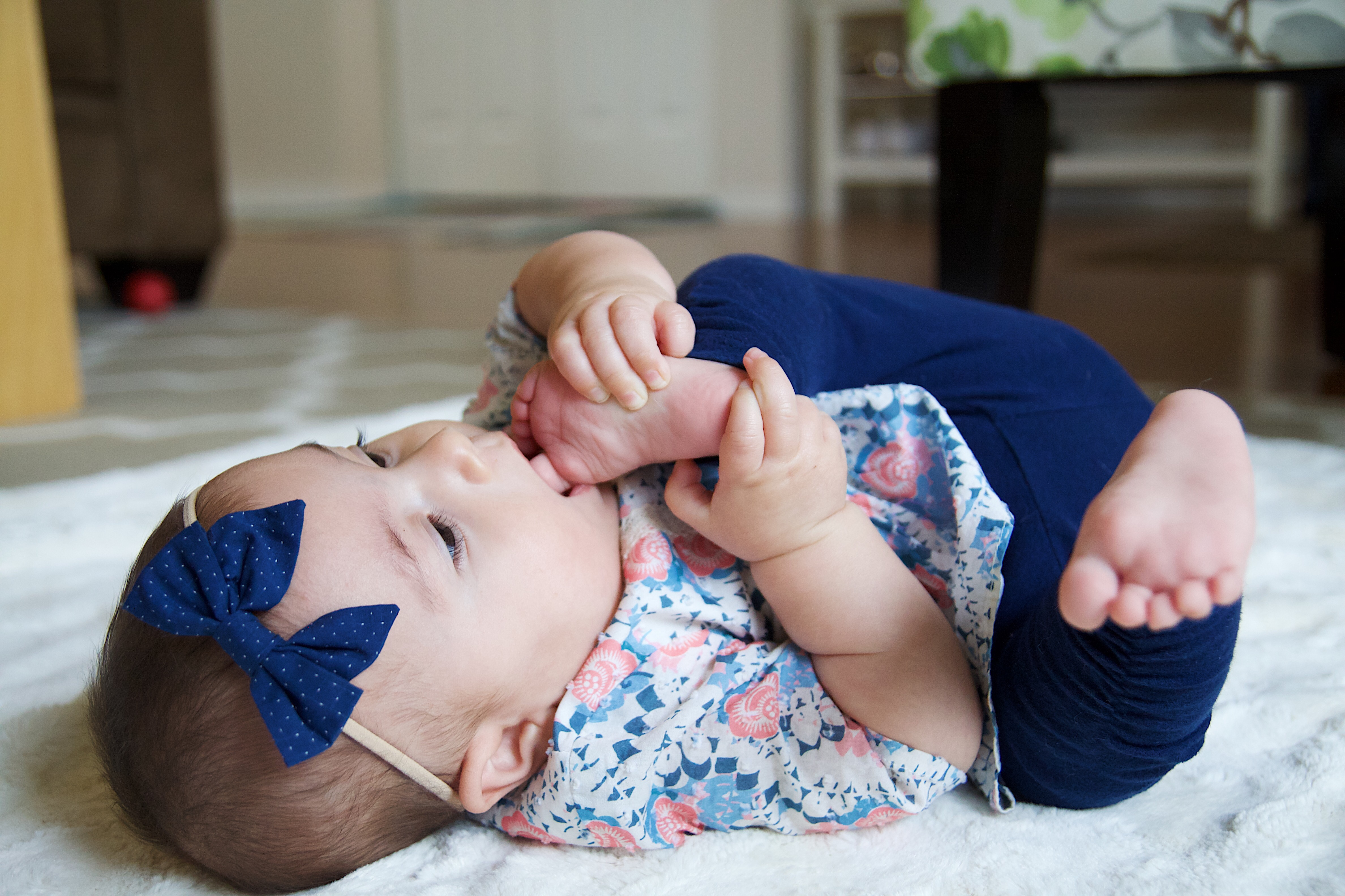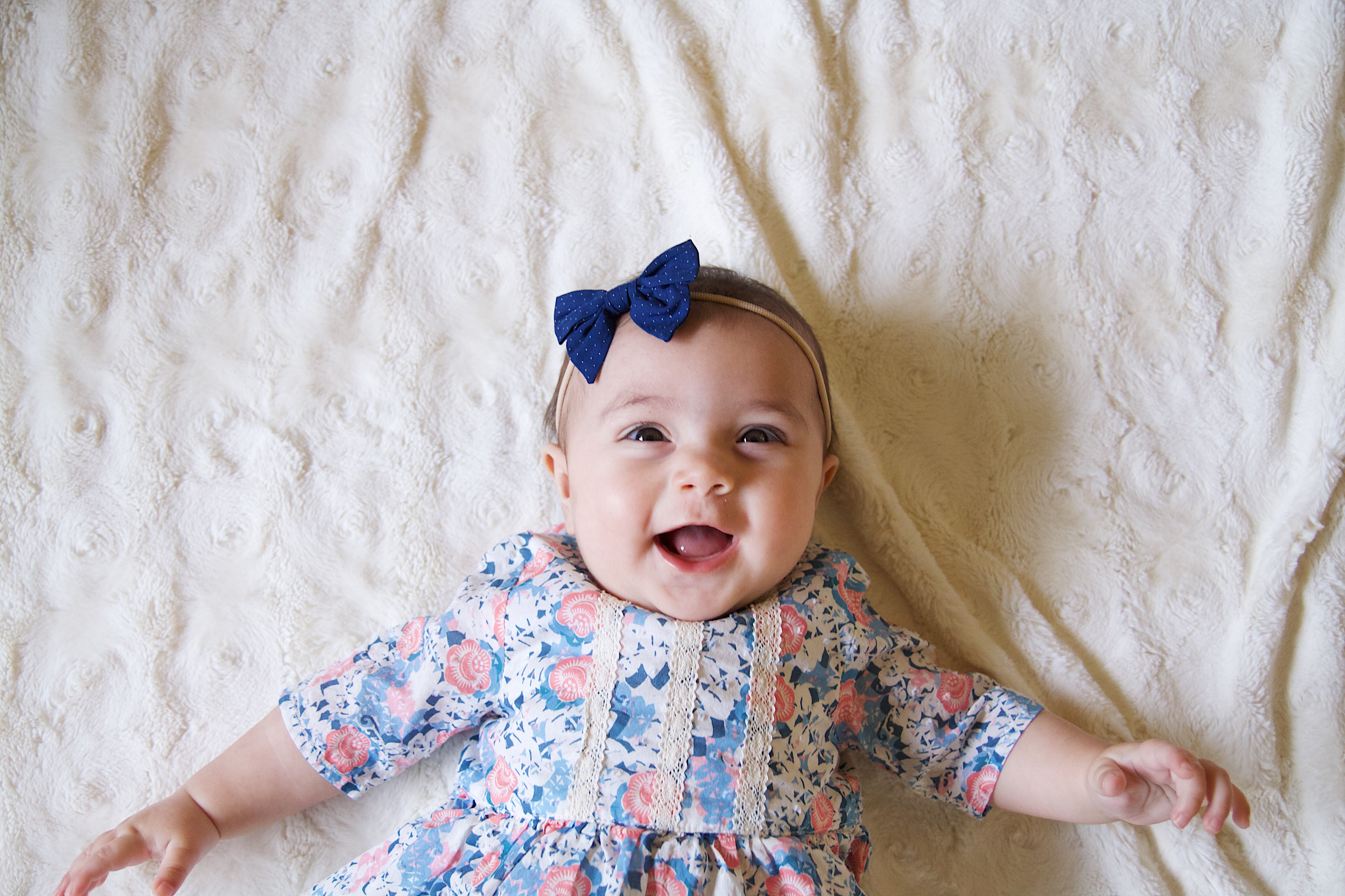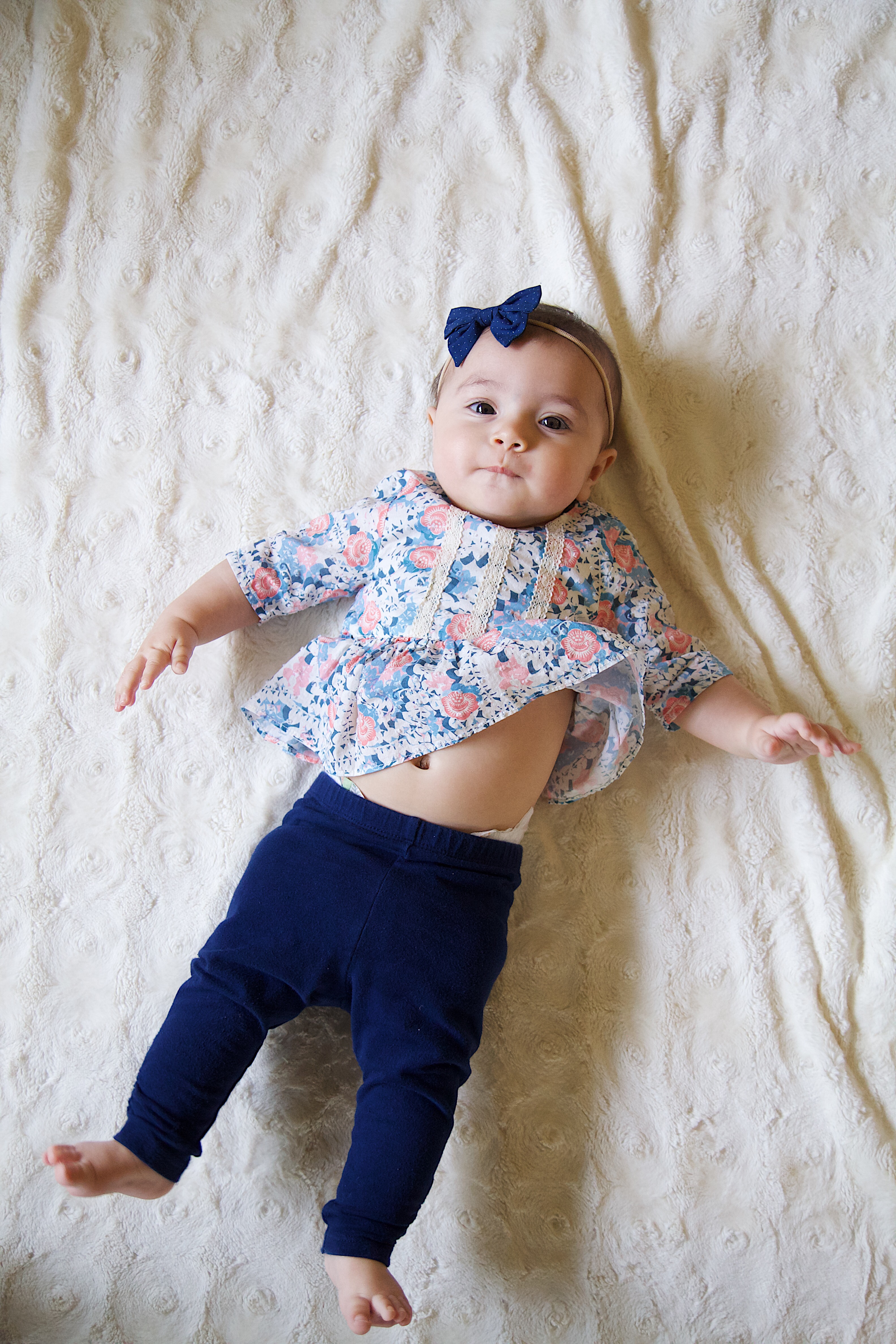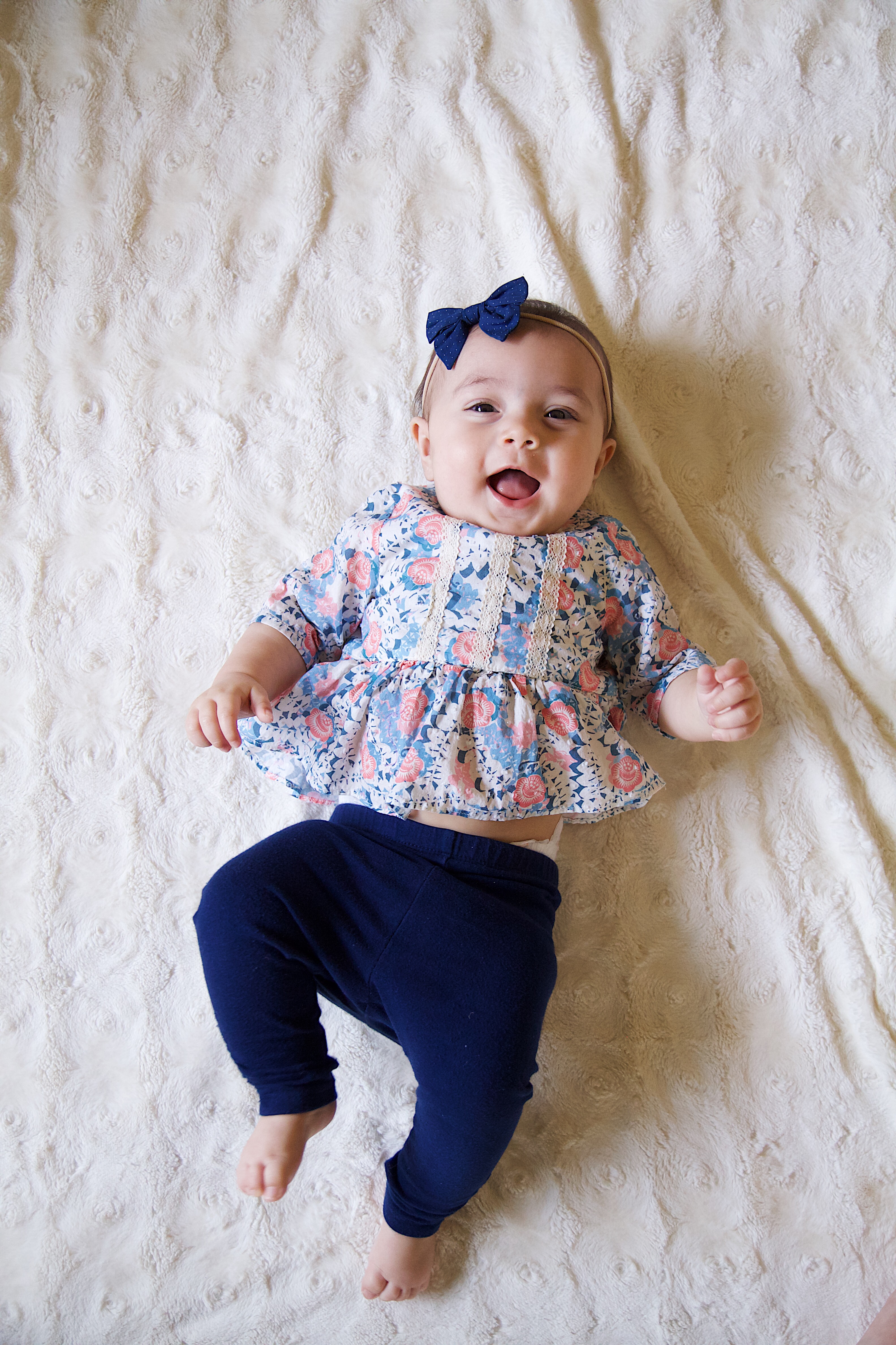 Happy 5 months, Lila (a couple weeks late on this blog post)! She laughed for the first time, but really only does it for her sister and “talks” a bit more now. She rolled from back to tummy when no one was looking for the first few times so now she can roll both ways. She loves playing with her feet, splashing in the bath, smiling at everyone, chasing her sister (with our help 😉) and she’s obsessed with everything Ellie does. Her smile is infectious and we just can’t get enough of her!