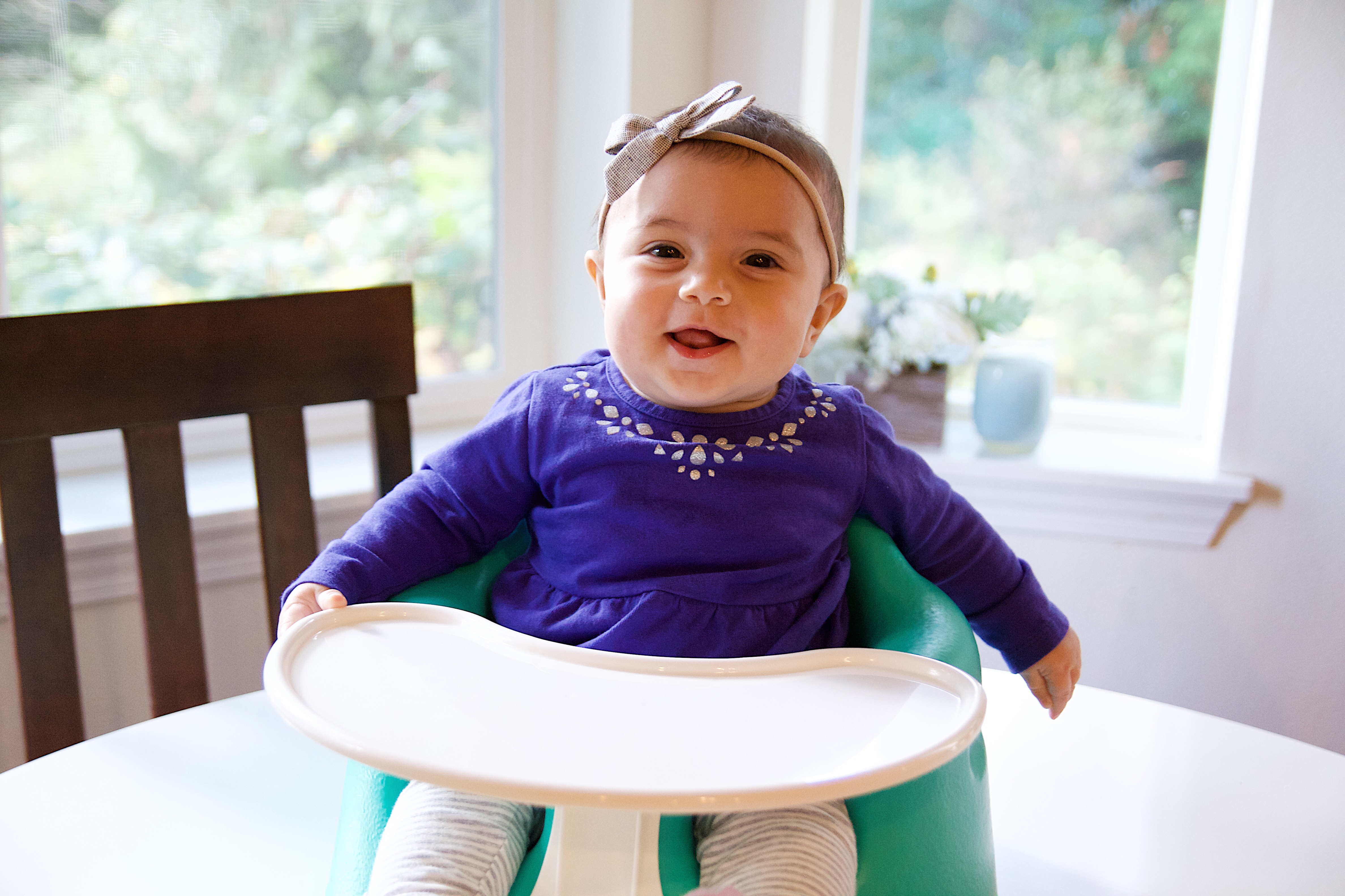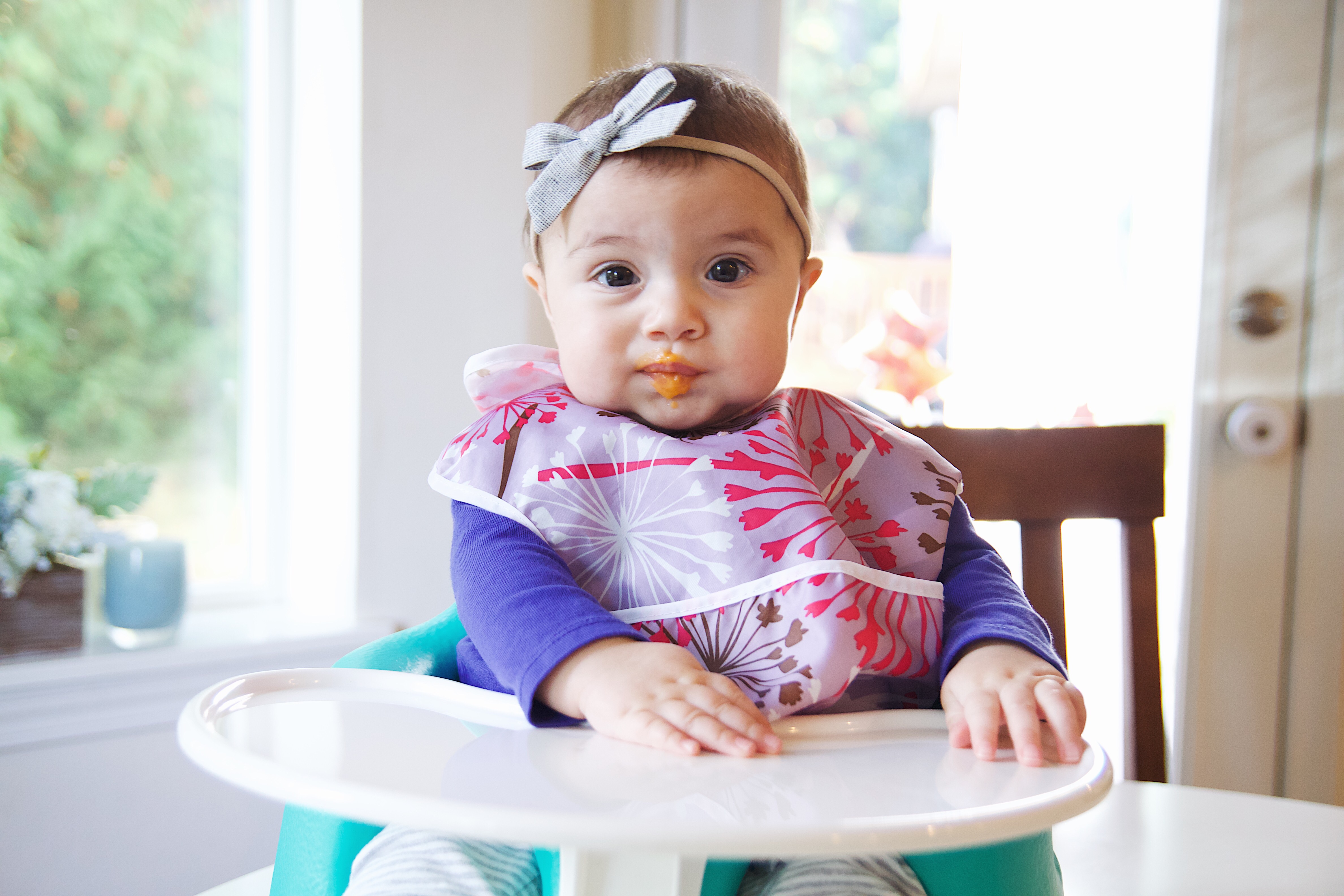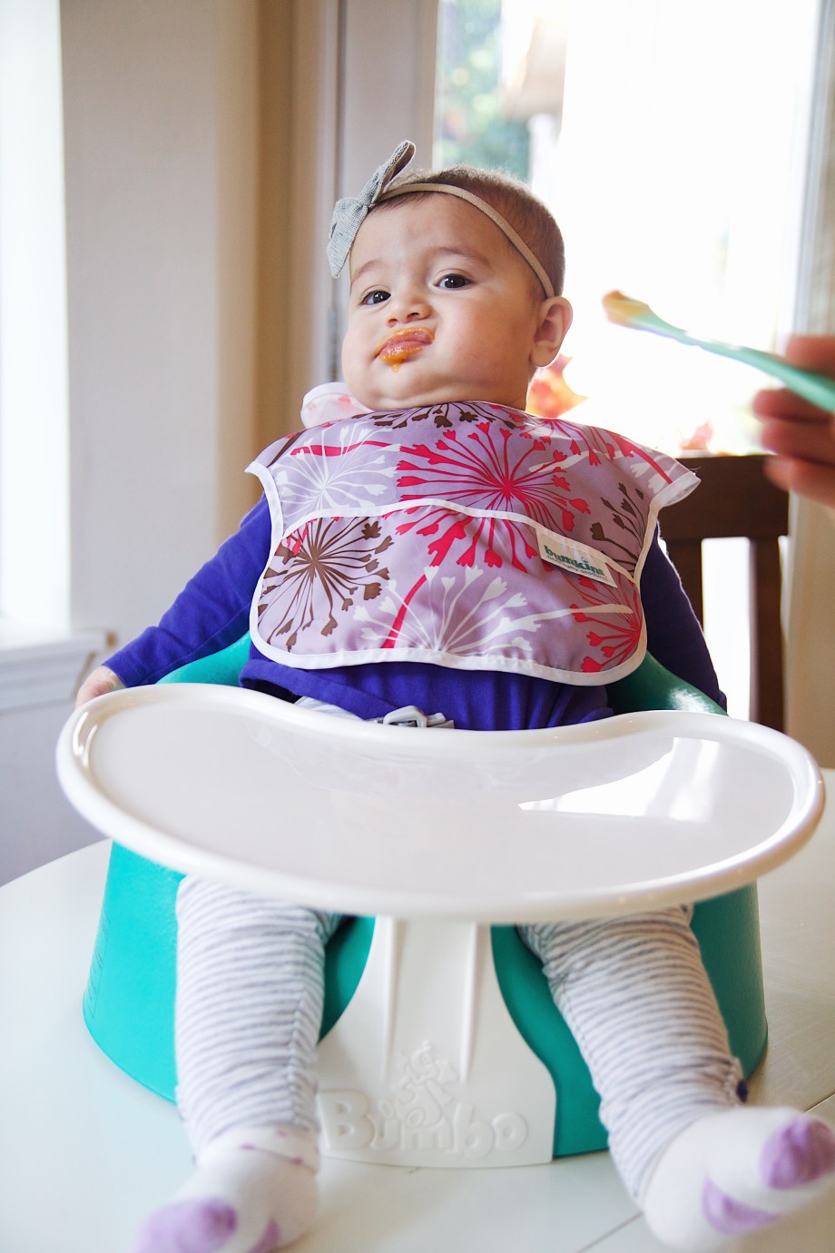 Lila’s been eyeing my food since she was two months old and has almost been successful at swiping it from me. We let her try her first food, which was sweet potatoes… only because we had some extra from dinner. She did not love it… I was surprised given her great interest in food, but maybe sweet potatoes aren’t her thing. It also could have been the Bumbo she was sitting in because she doesn’t always like to sit there. We’ll try something new soon and in a high chair hopefully.