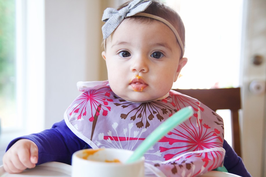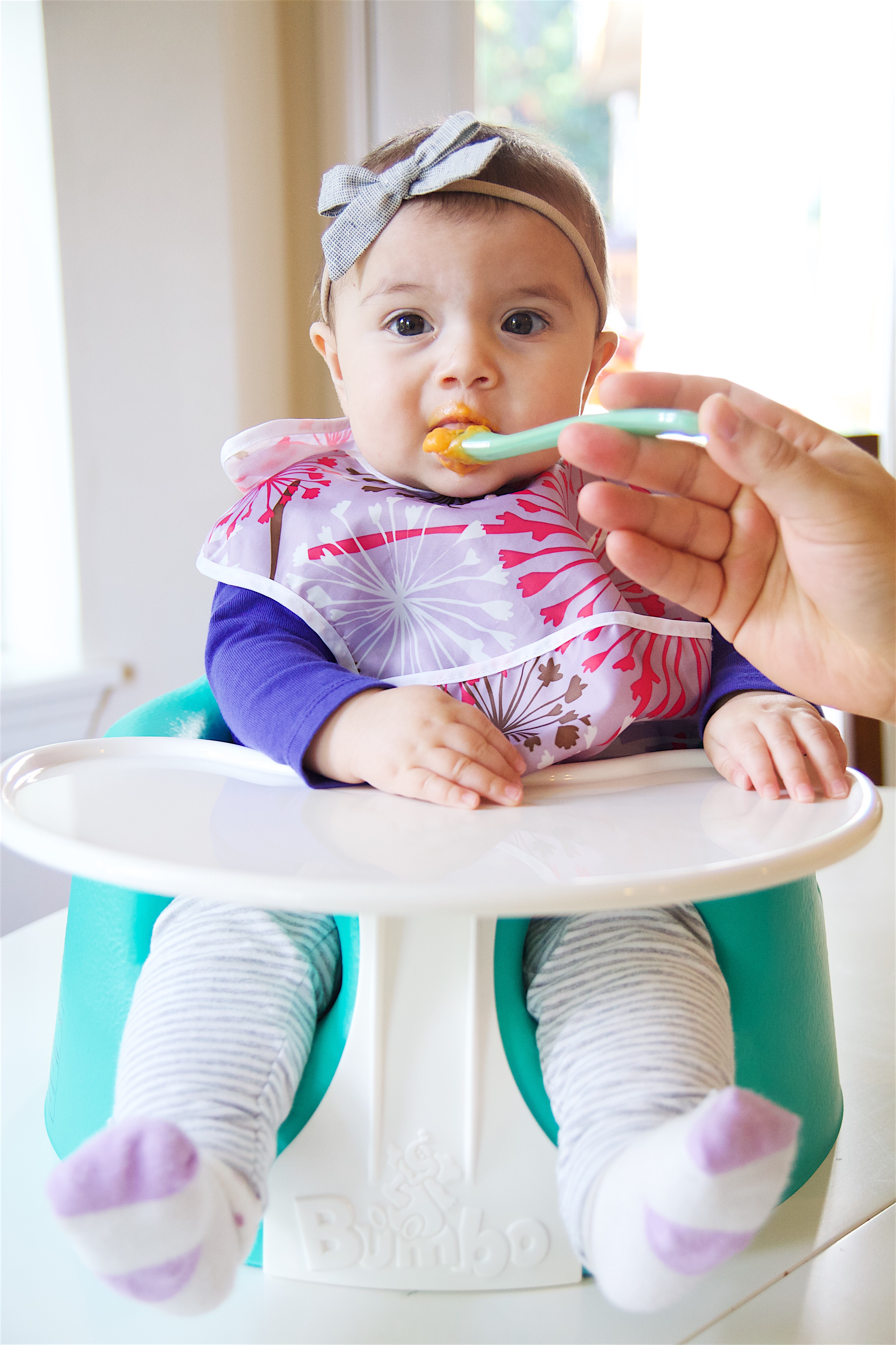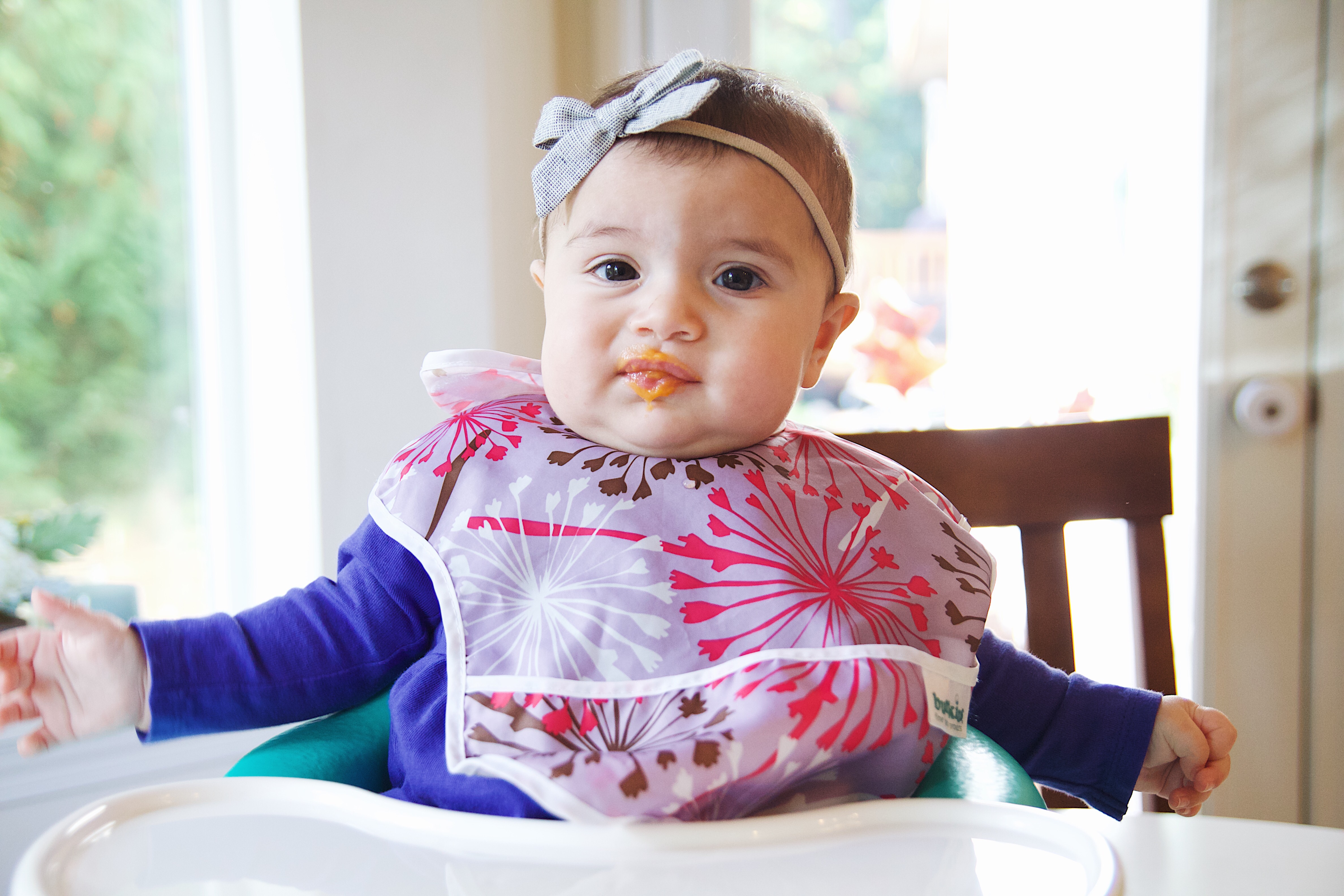 Lila’s been eyeing my food since she was two months old and has almost been successful at swiping it from me. We let her try her first food, which was sweet potatoes… only because we had some extra from dinner. She did not love it… I was surprised given her great interest in food, but maybe sweet potatoes aren’t her thing. It also could have been the Bumbo she was sitting in because she doesn’t always like to sit there. We’ll try something new soon and in a high chair hopefully.