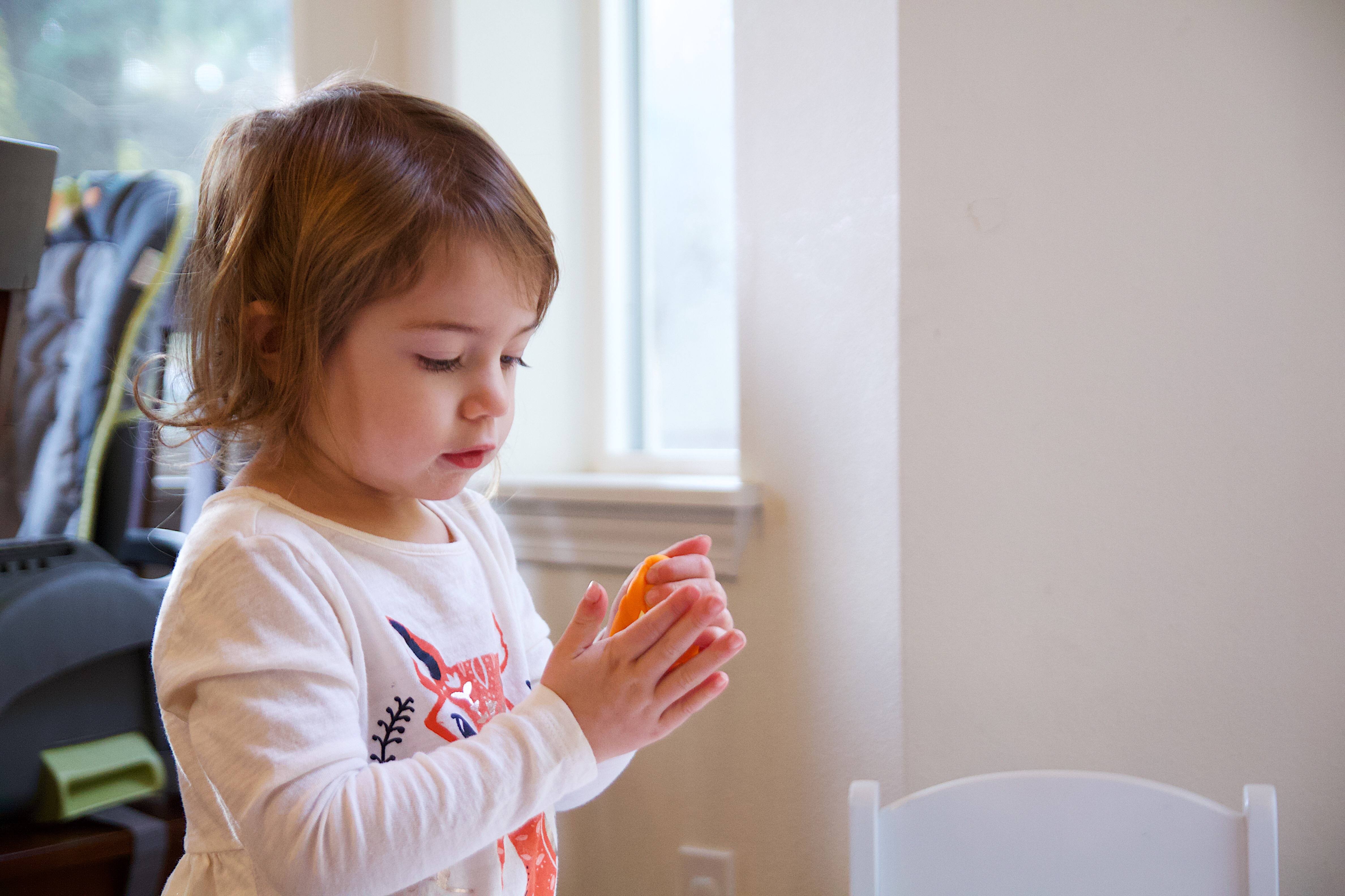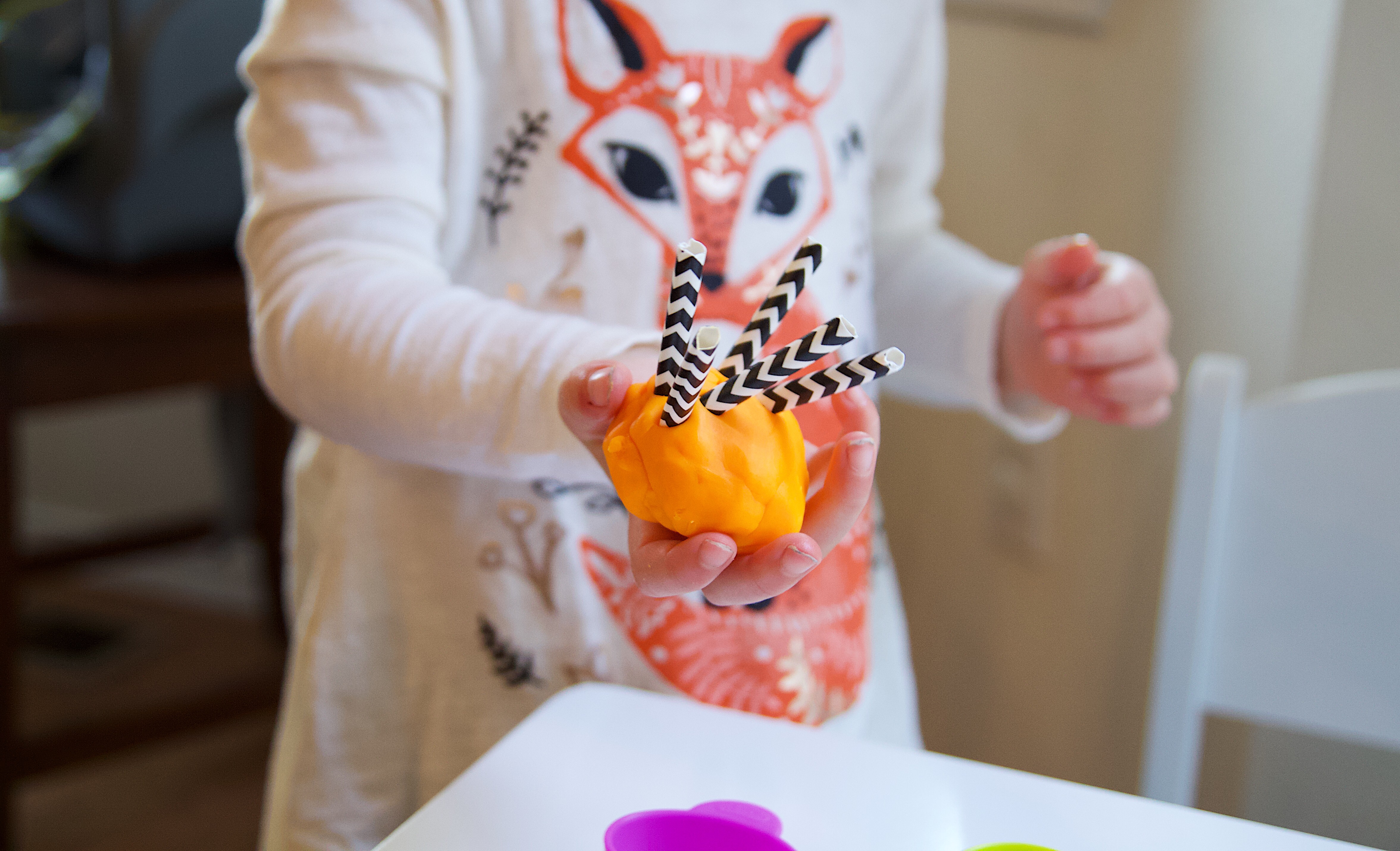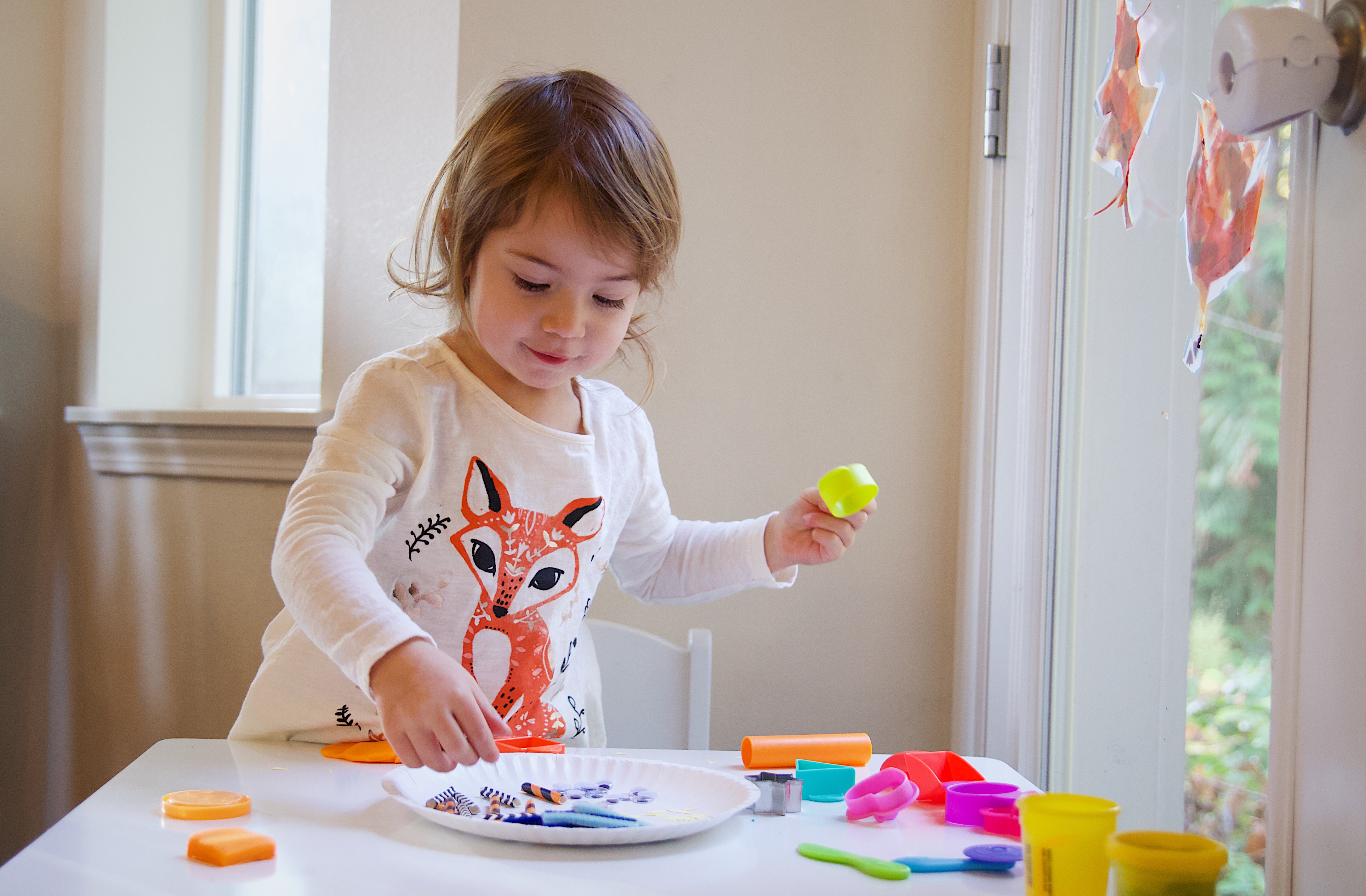 Ellie is obsessed with play doh right now. She could go through a can a week at the rate she plays with it so naturally I tried to come up with an activity using it. I tried to get her to make little play doh monsters, though it really ended up that she just played with play doh while I made the monsters. Oh well, she had fun either way and got to open up a fresh can of play doh.