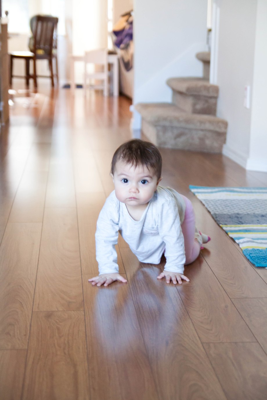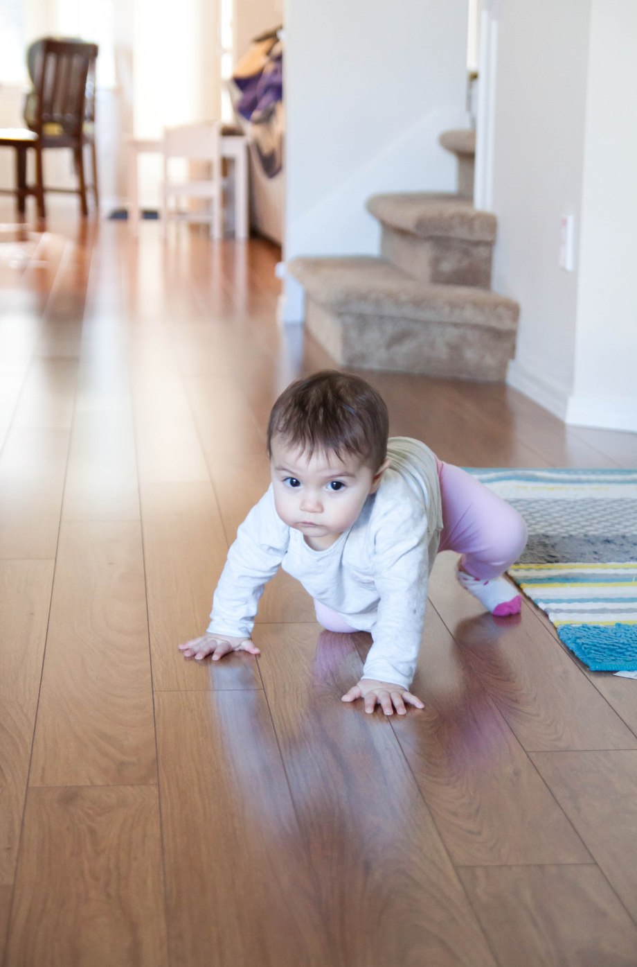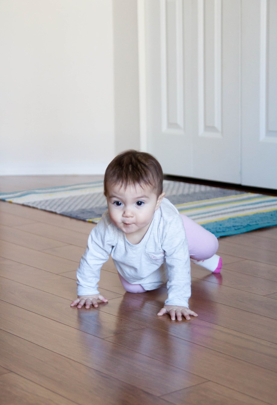 She started crawling not long after she turned 7 months. I love watching her personal style as she does it – using her left foot to help her along. These little details always get me :).
