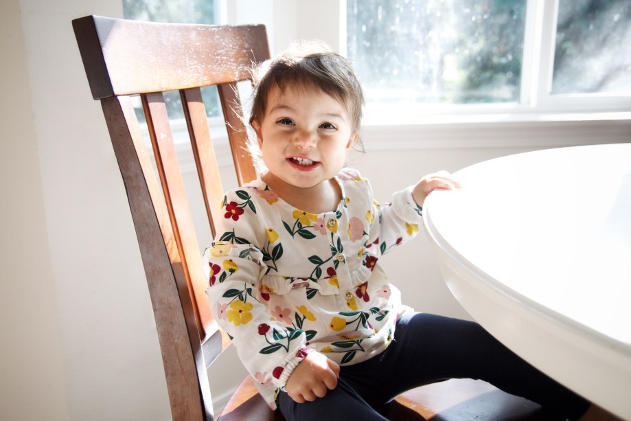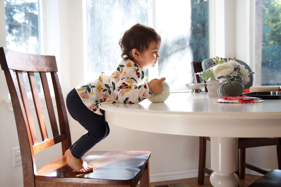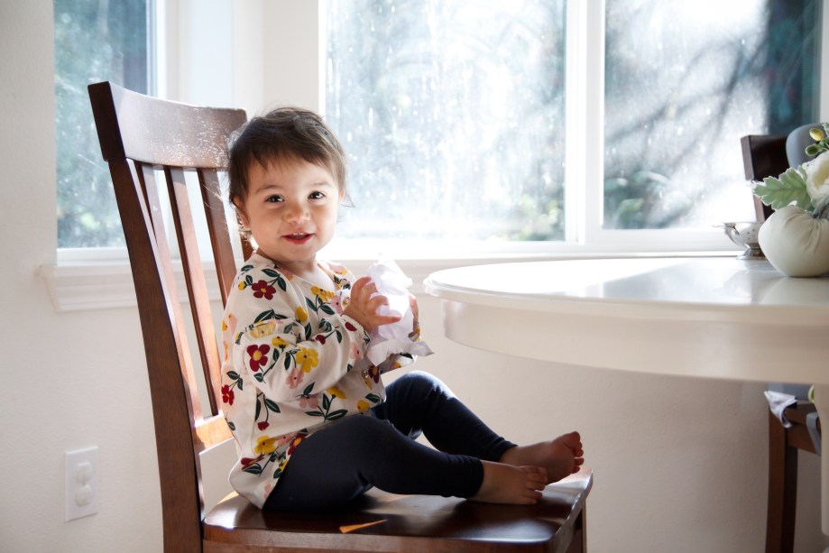 Lila can often be found on one of our chairs, sitting or standing. Nothing is safe anymore. Ellie used to take her crafts, games or anything with small pieces to the table, but that doesn’t work anymore. Lila will surely find it. She sure is cute, though 😊.