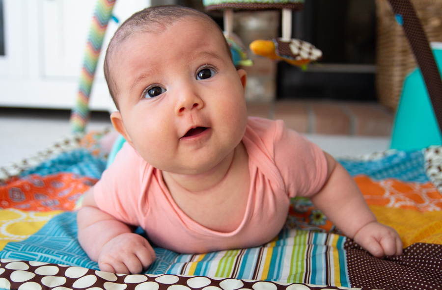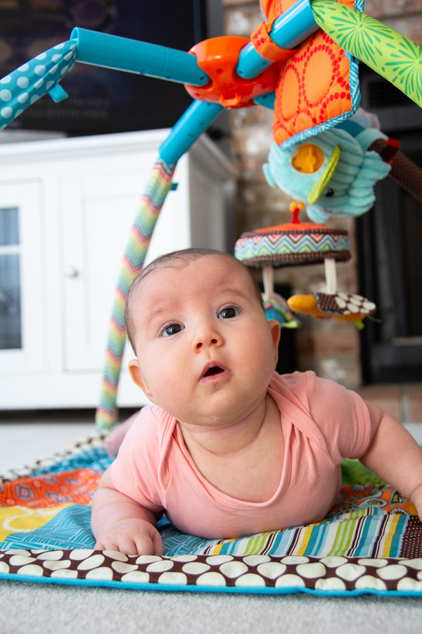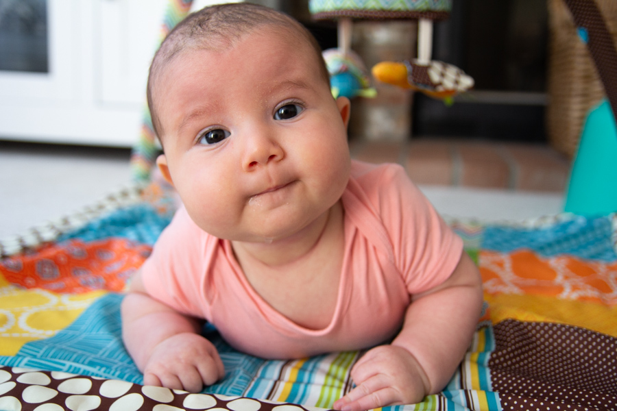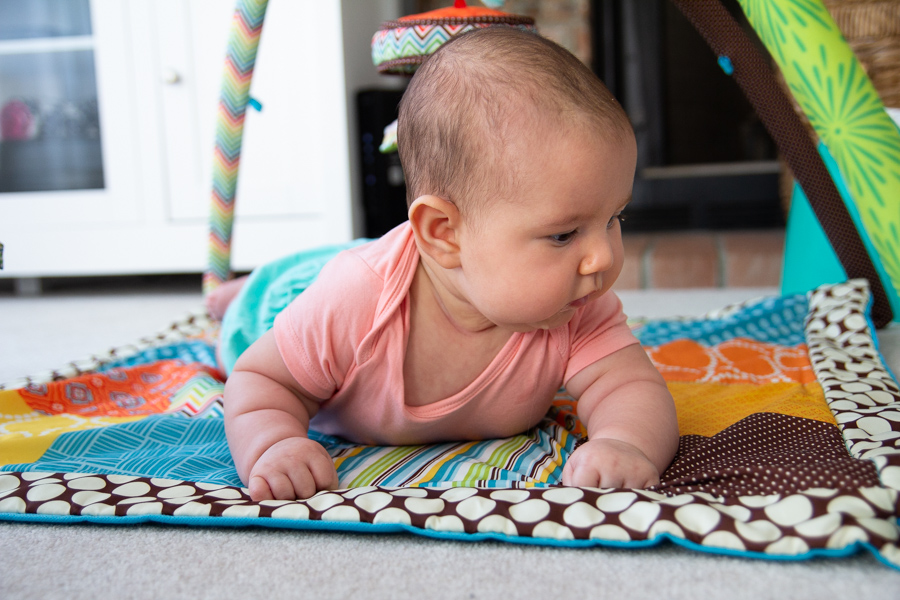 She’s been great at tummy time from the start and she rolled over from tummy to back a few times for a couple of days, but hasn’t been inclined to do so since then.