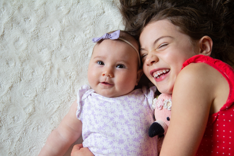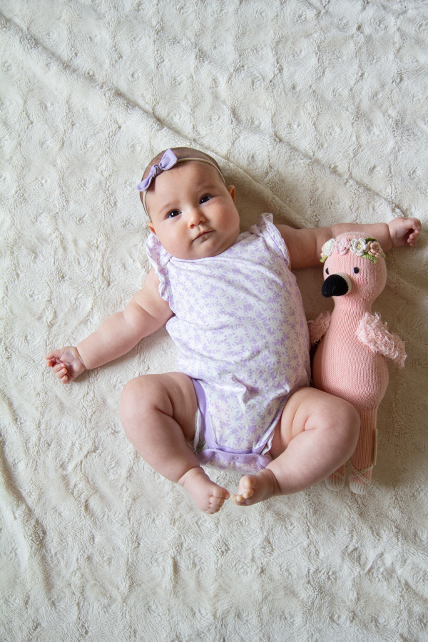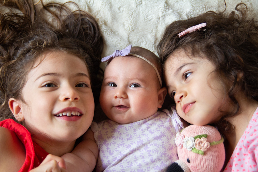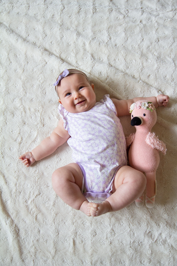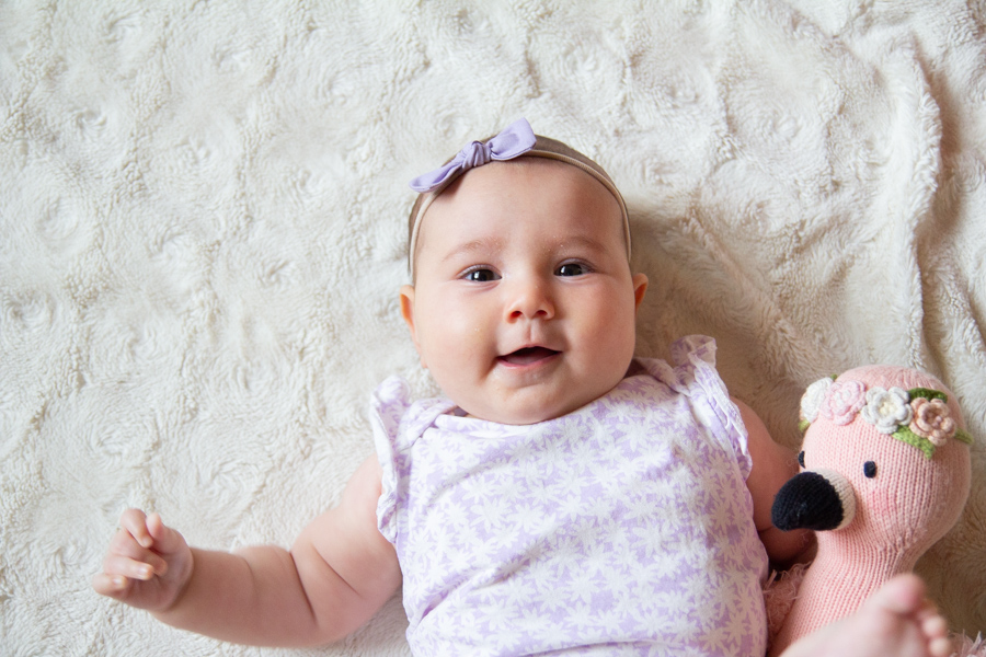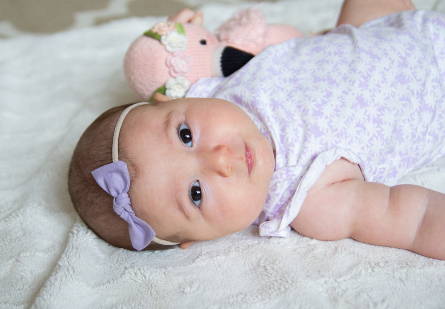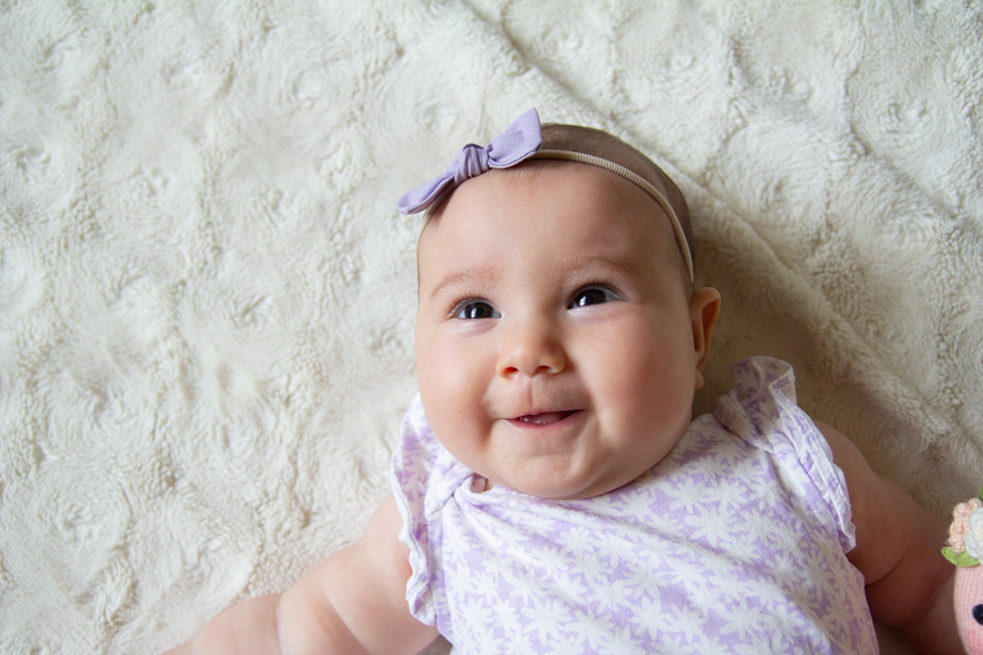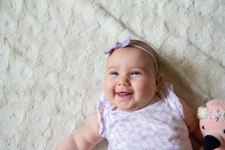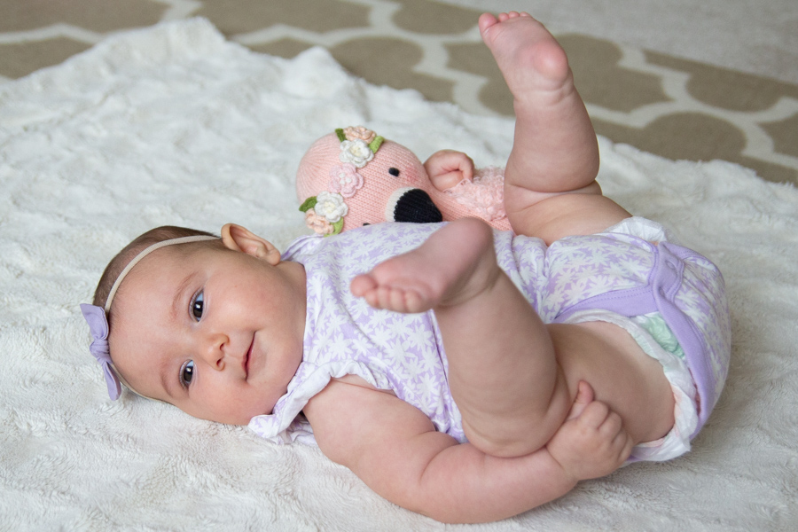Happy 4 months, Olivia! She loves eating her hands, grabbing onto everything (especially her sisters’ hair), curling her toes, smiling, splashing in the bath and watching her sisters do crazy dances. She can roll onto her back, but prefers not to do it much, she’s laughing more and more and she’s found her feet. She loves being really loud when she talks and has learned to spit at us. She seems like a giant and is growing so fast. We love her so!