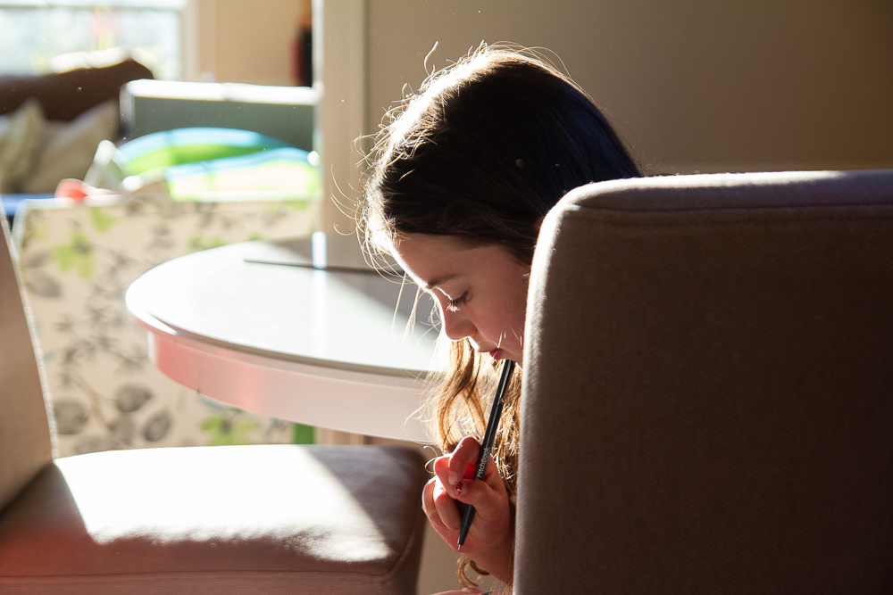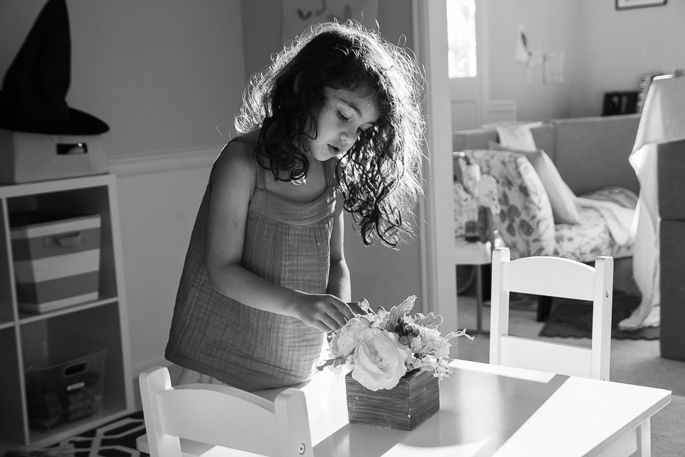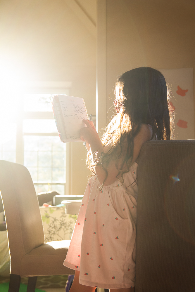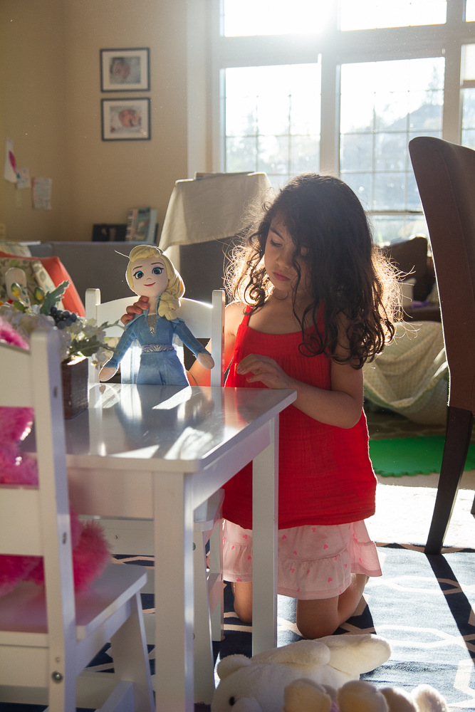 Just a summer afternoon where the girls played in the dining room that we turned into a baby/toddler safe playroom (since we rarely used it as a dining room anyway). A large fort built in the background, Ellie working on some writing, Lila setting up a pretend restaurant for her stuffies, and Livvy just happy to play and be near her sisters.