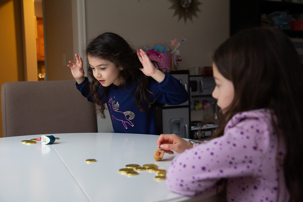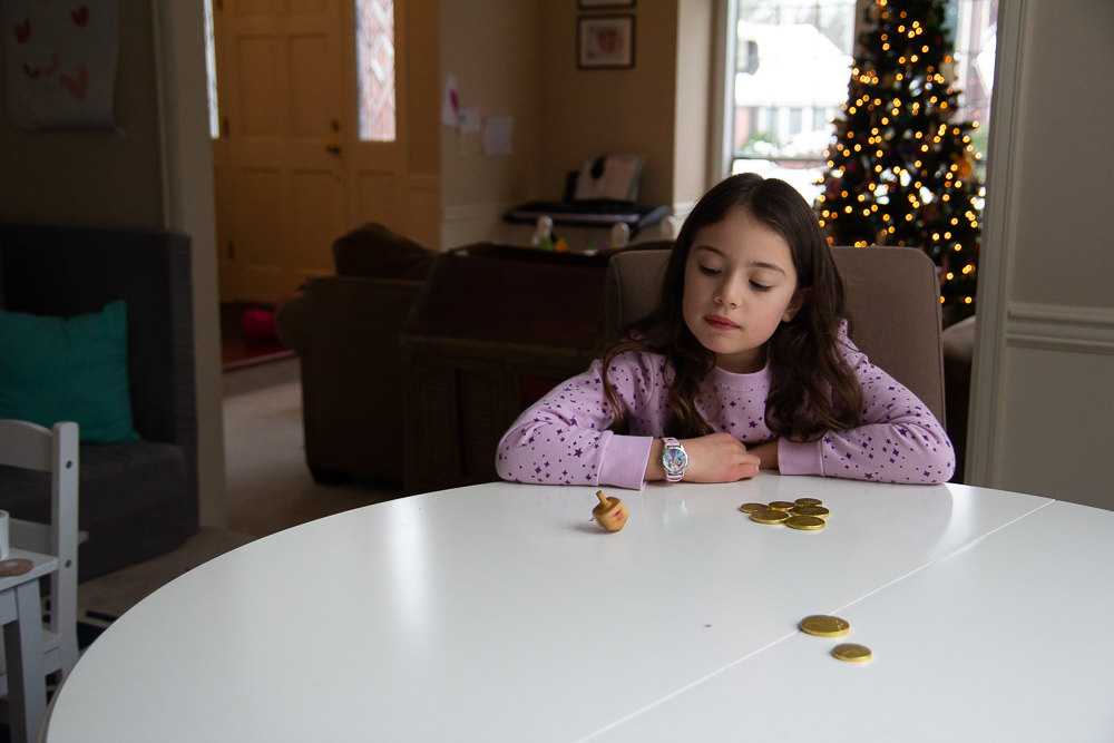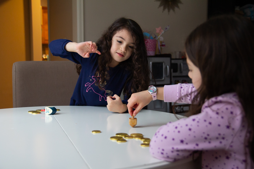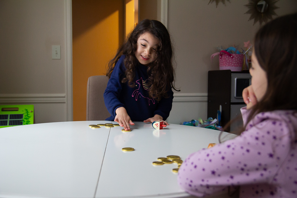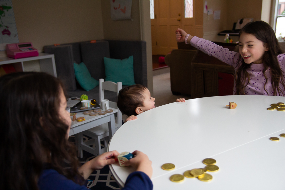 They love playing dreidel at Hanukkah, especially Ellie. I think Lila mostly just wants the chocolate at the end :). Olivia loved watching the dreidels spin and would often bring me one saying “spin, spin”.