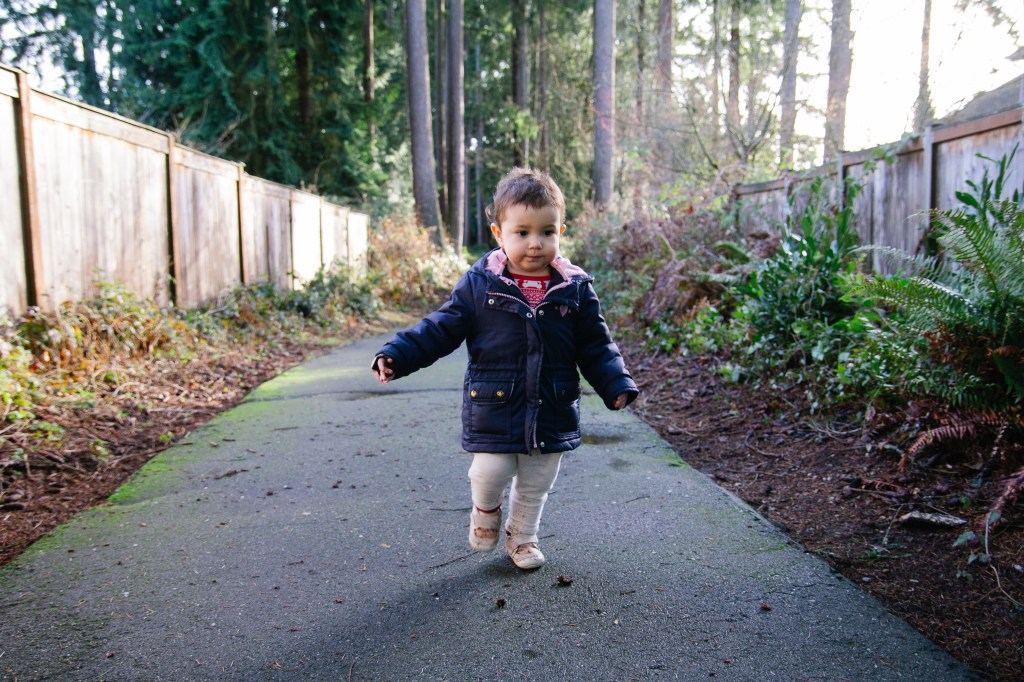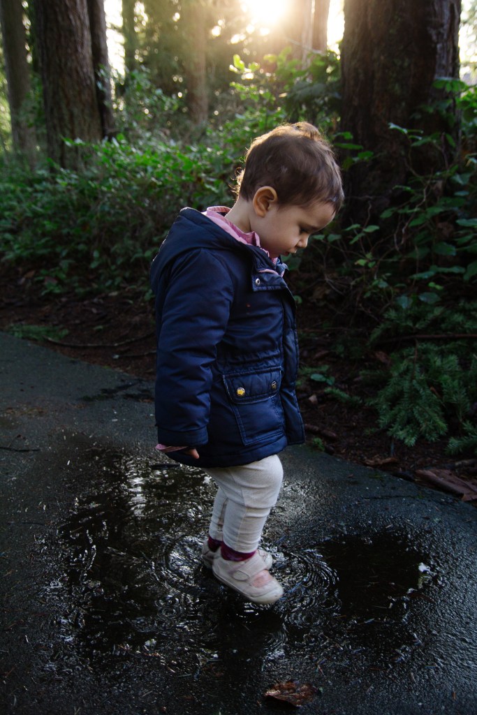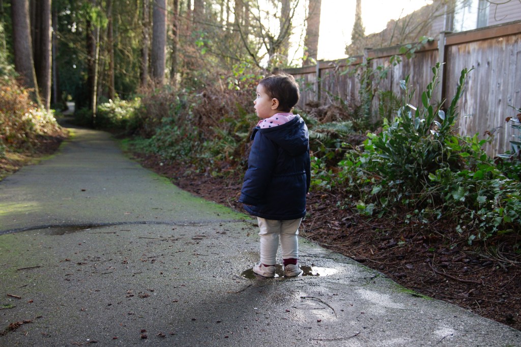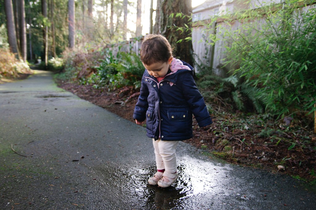 Olivia loves going for walks and finding the puddles to jump in. I love this age when they just want to explore everything and entertain is easy. We just go outside and her mood instantly lightens. I wish that still worked on the big kids haha.