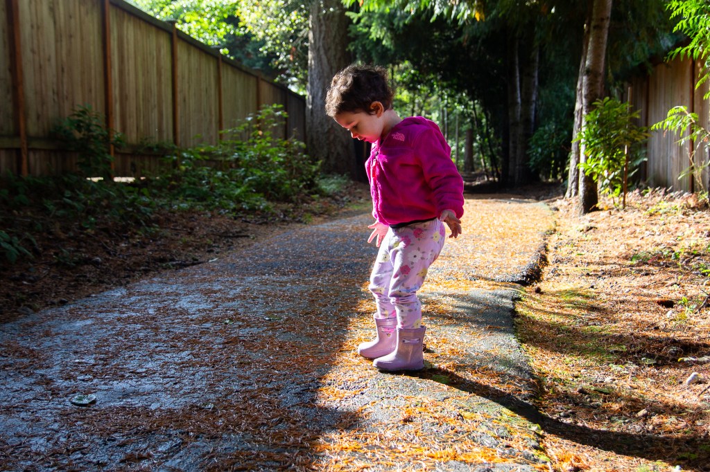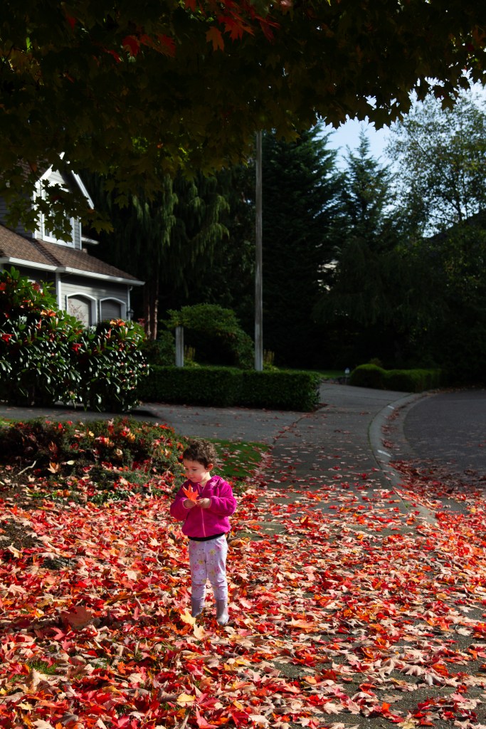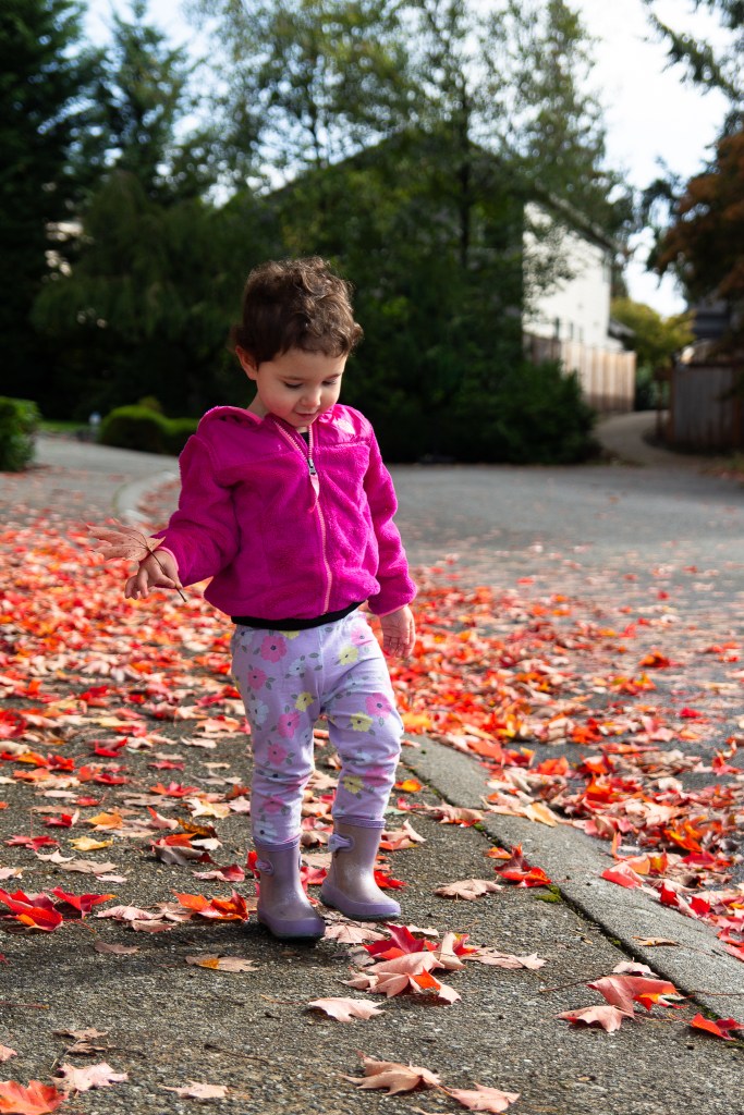 Out on one of our many walks around the neighborhood in Olivia’s “beep, beep” and we saw a beautiful tree with lots of leaves to explore. She loves making bouquets out of flowers, sticks or leaves. (Please note the boots on the wrong feet that she put on herself ☺️)